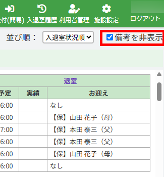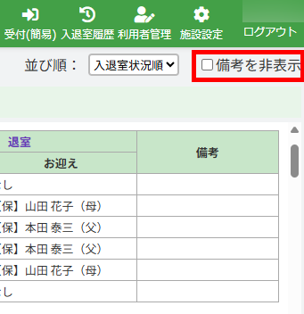 児童や保護者に画面が見えてしまうため、備考欄を表示したくないという場合、画面右上にある「備考欄を非表示」を押すことによって非表示にできます。