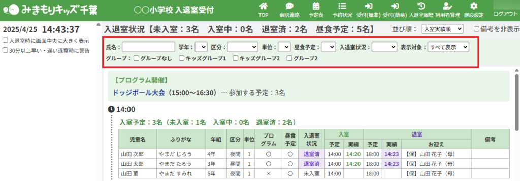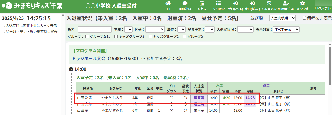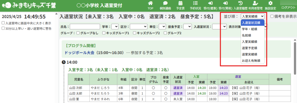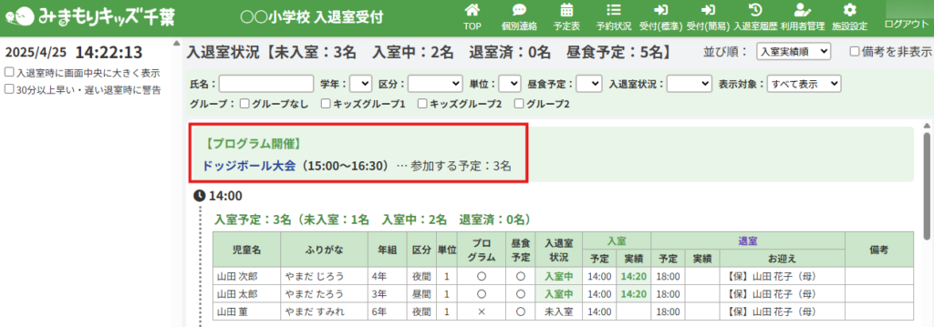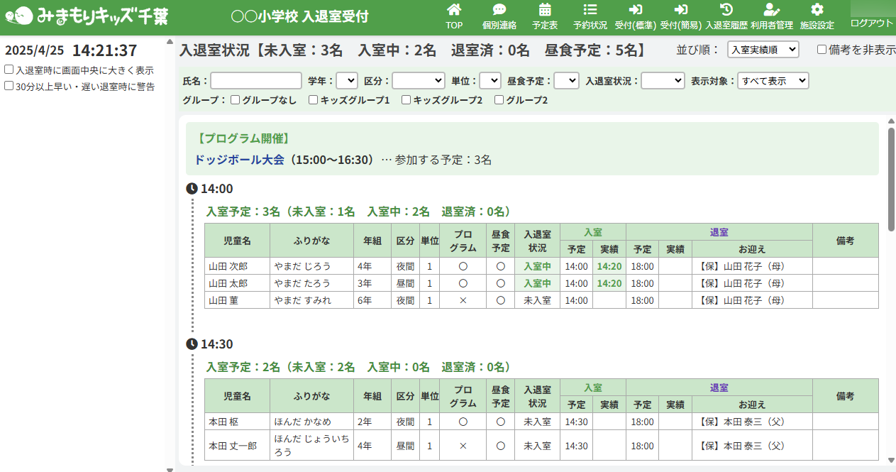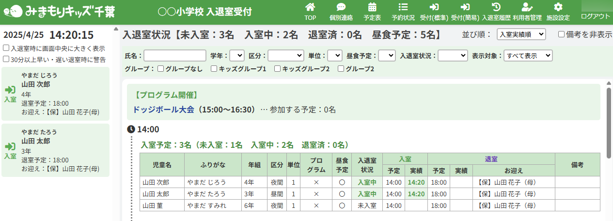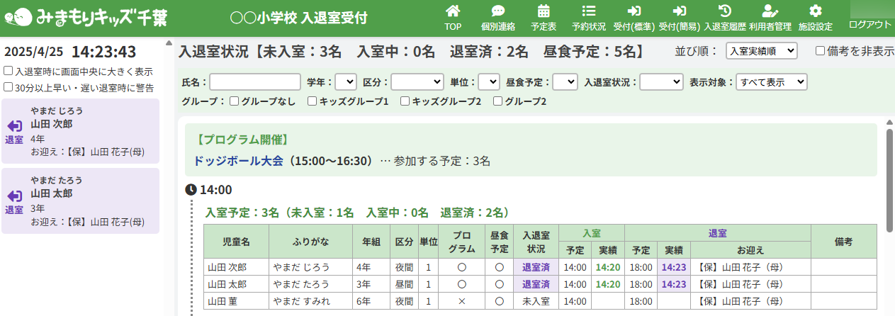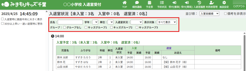 入室予定の児童が「入室予定」欄に一覧となって表示されます。