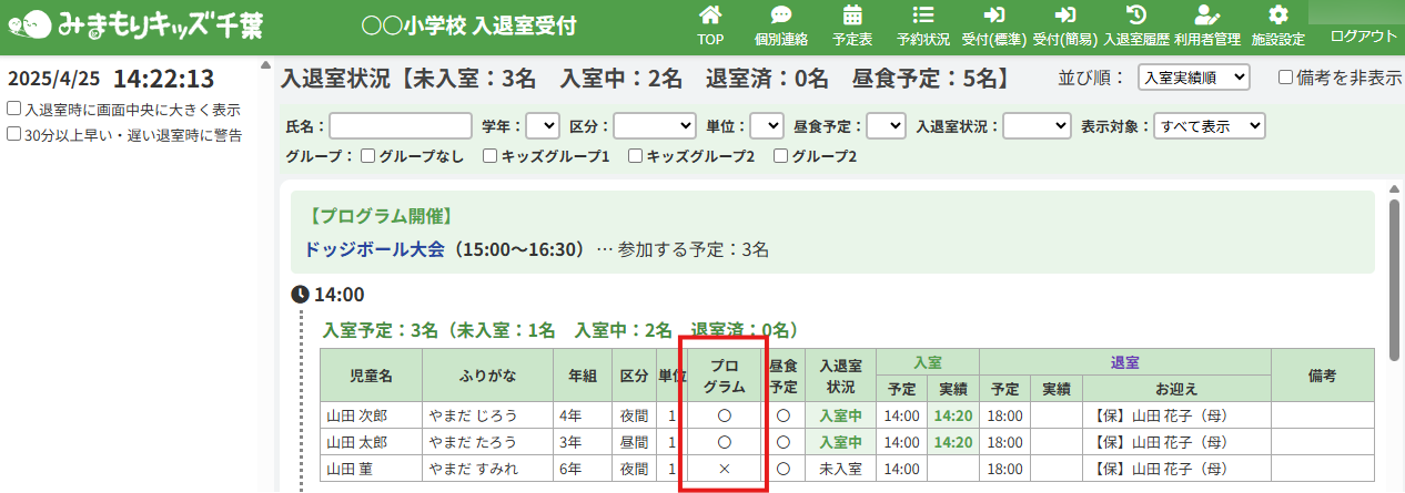 「プログラム」欄に「〇」が表示されている児童がプログラムに参加、「×」が表示されている児童がプログラムに参加しない児童となります。
