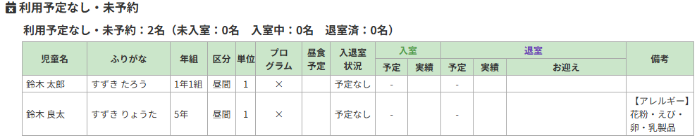 利用予約がない児童はページ下部の「利用予定なし・未予約」欄に一覧表示されます。