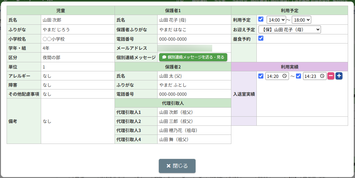 児童の氏名欄をクリックすると、学年・組・保護者の氏名等登録されている情報を確認できます。