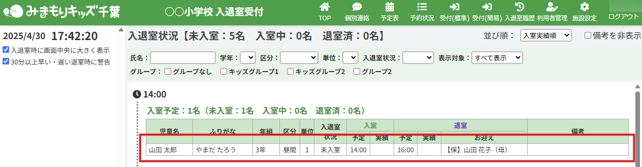 4.変更内容に応じた「入室」欄、「退室」欄の実績が変更されていることを確認してください。