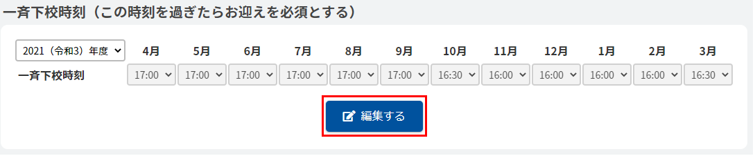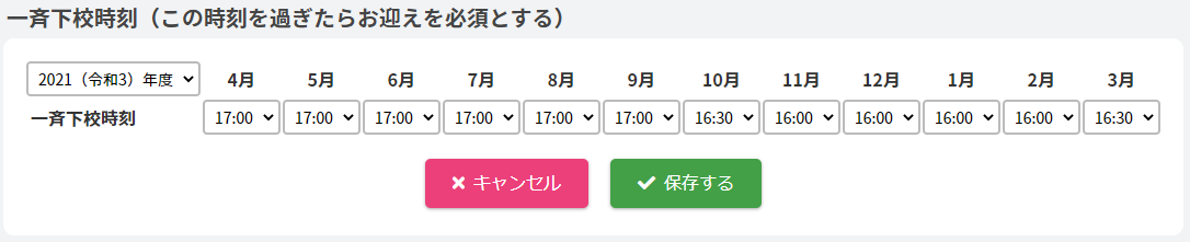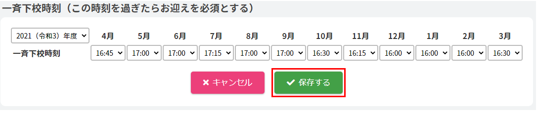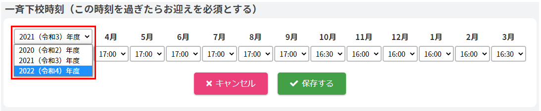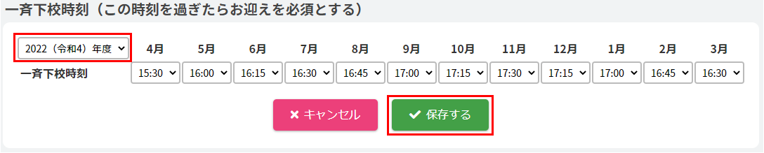 2.設定したい年度を選択し、一斉下校時刻を変更し【保存する】ボタンを押す。