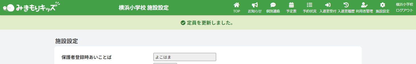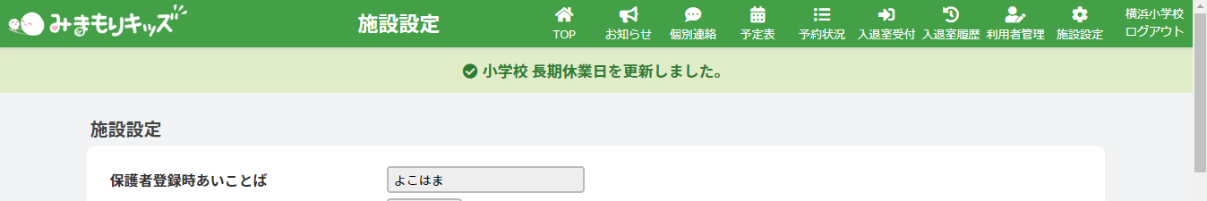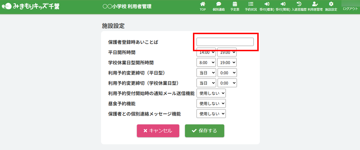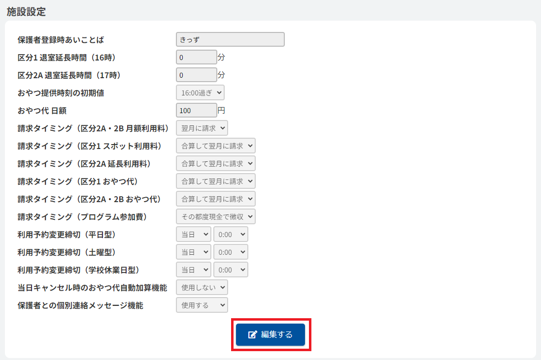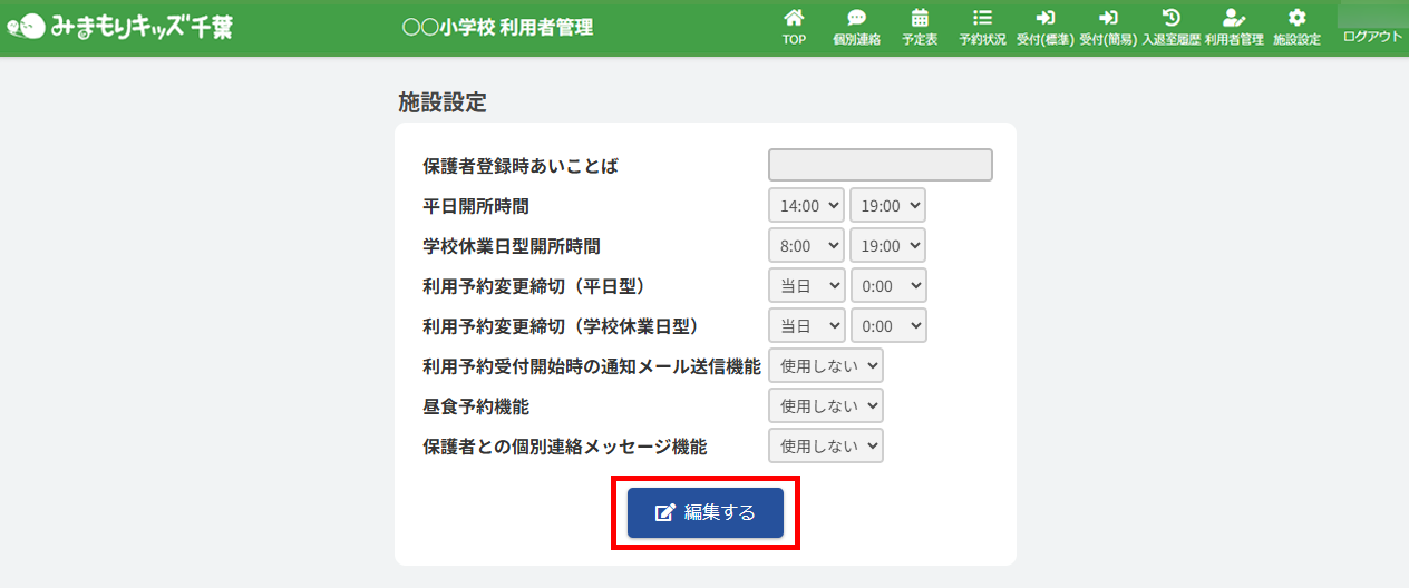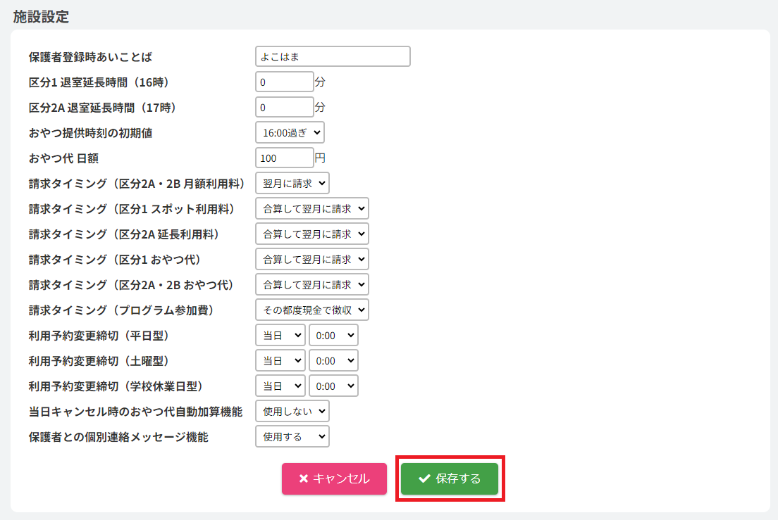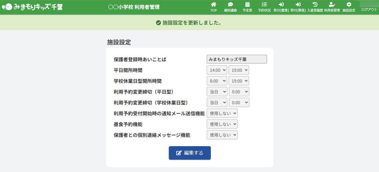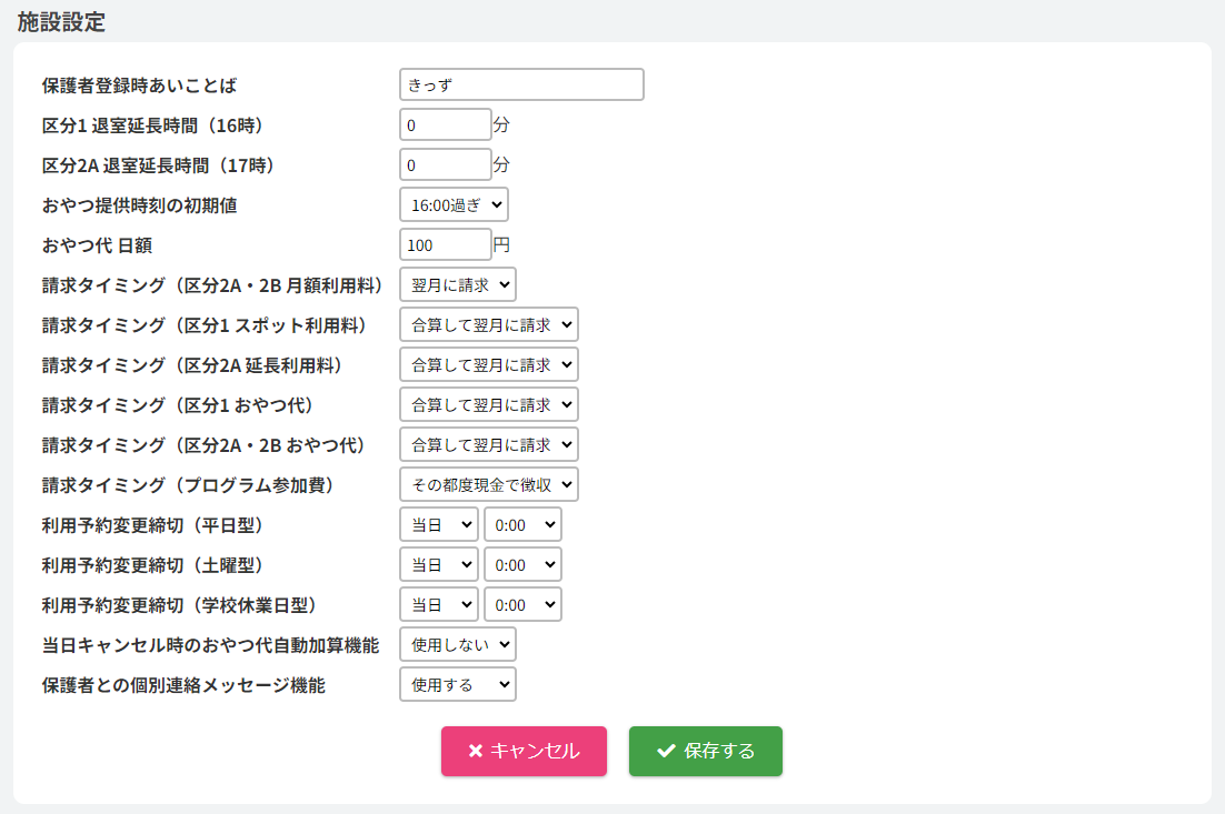 施設開所日(土曜型)において、保護者が利用予約を変更できる時間の締切を設定できます。締切後は電話等でお問い合わせを頂き、施設側で変更します。