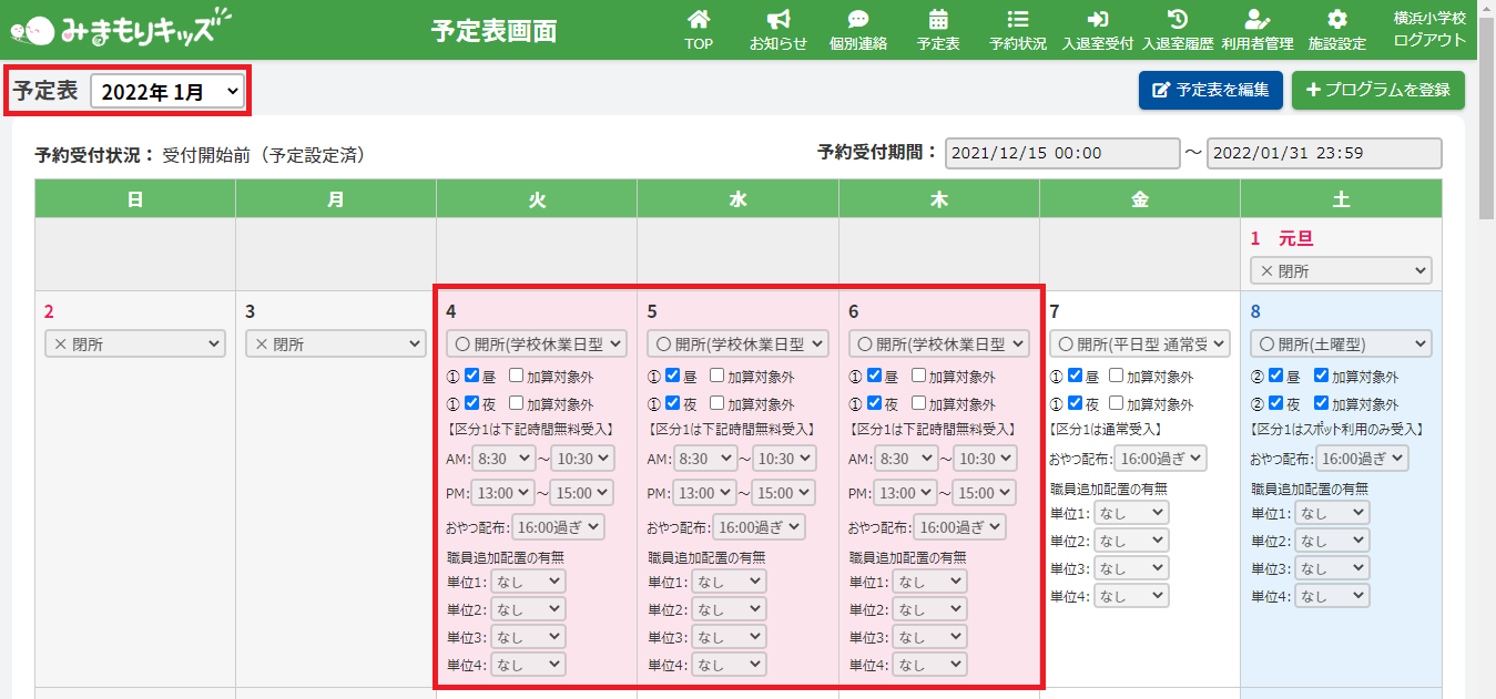 設定された期間内の平日が「平日型」から「学校休業日型」に変更されます。