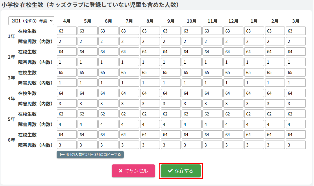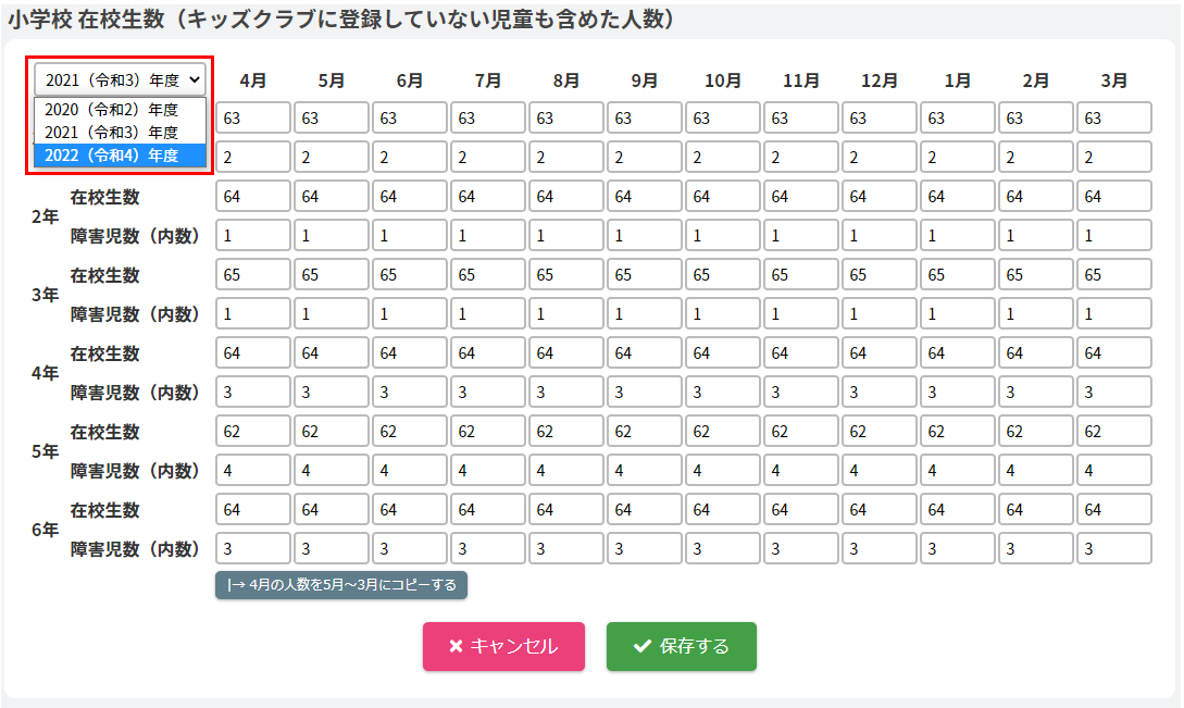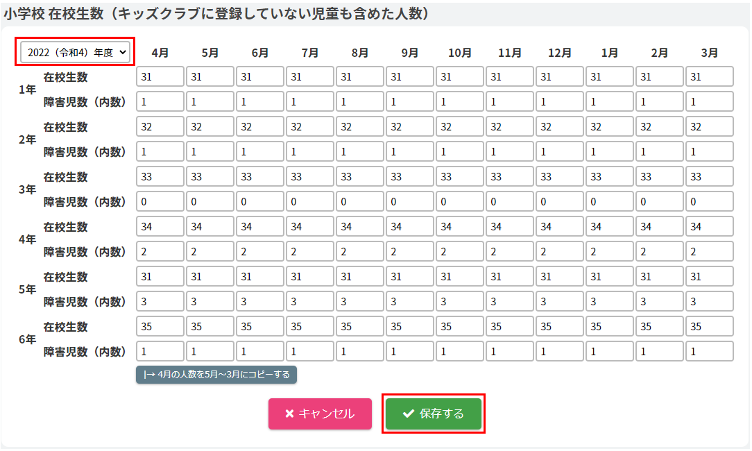 2.設定したい年度を選択し、小学校 在校生数を変更し【保存する】ボタンを押す。