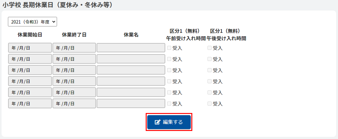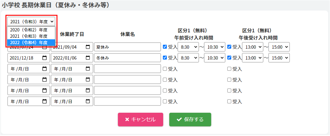 1.小学校 長期休業日の年度選択肢から、設定したい年度を選択する。