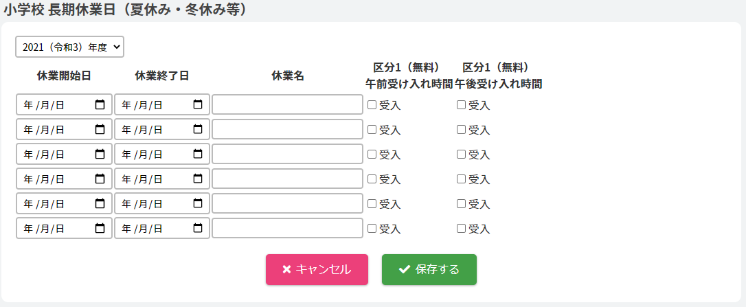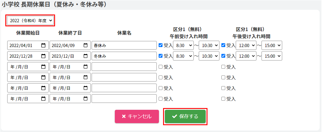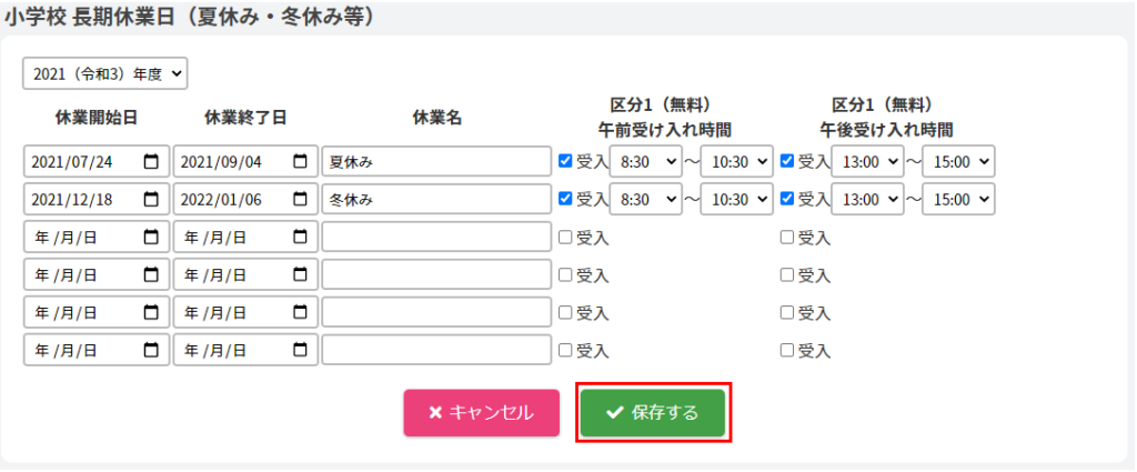 2.設定したい年度を選択し、小学校 長期休業日を変更し【保存する】ボタンを押す。