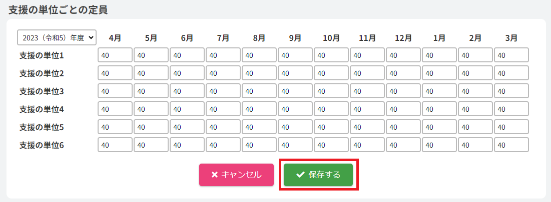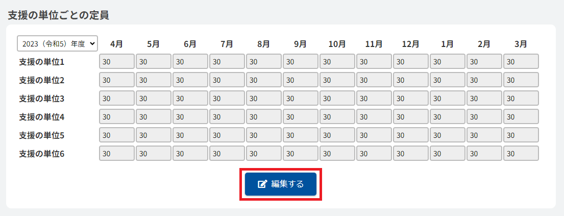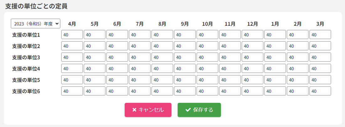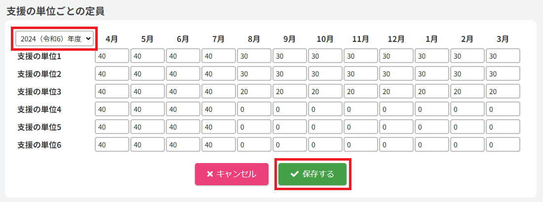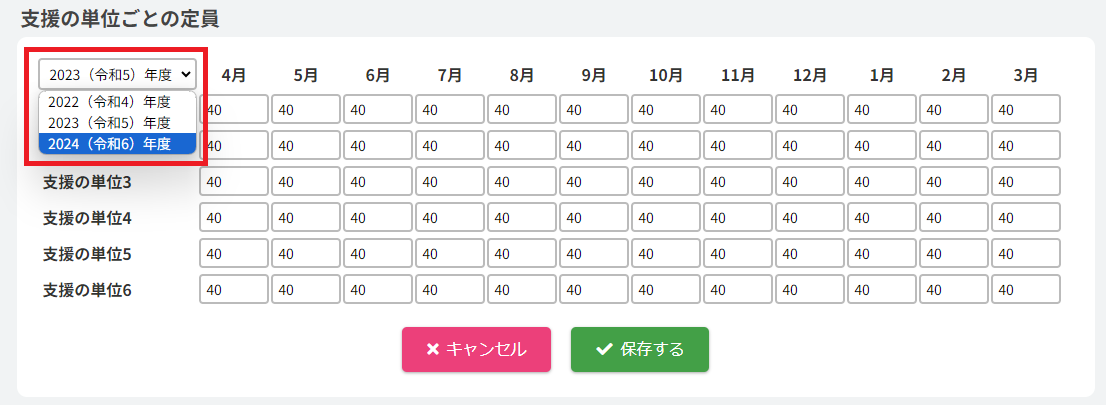 1.支援の単位ごとの定員の年度選択肢から、設定したい年度を選択する。