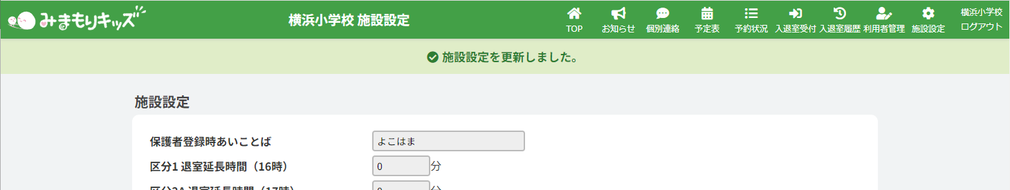 通常では区分1の児童は退室が16:00を過ぎるとスポット利用料が発生しますが、この延長時間を設定すると通常利用として受け入れる時間を延長できます。