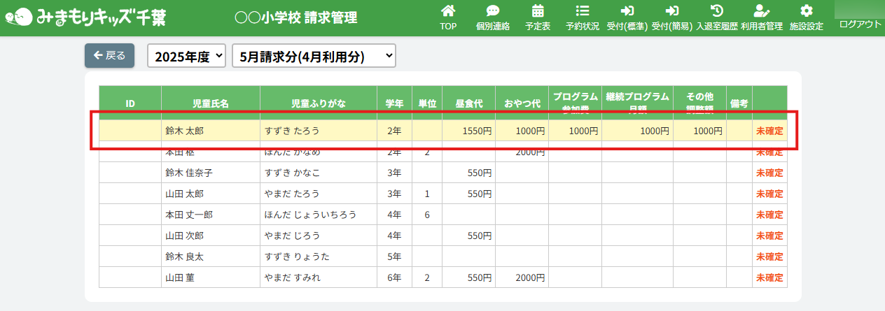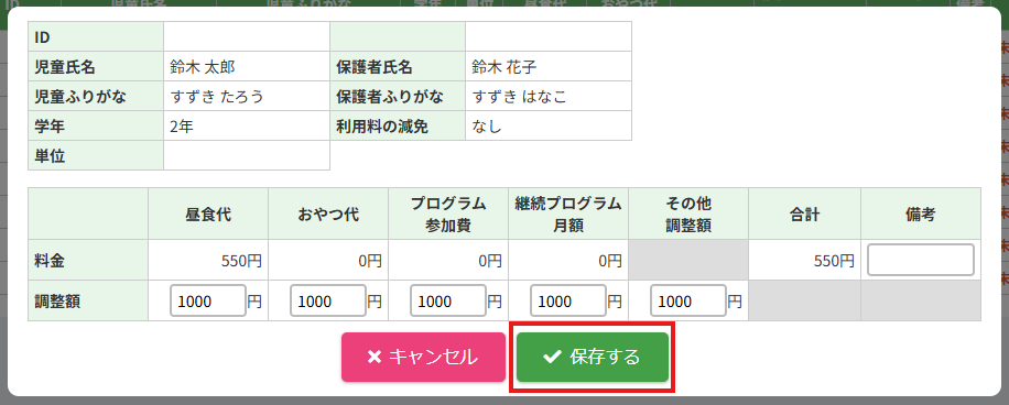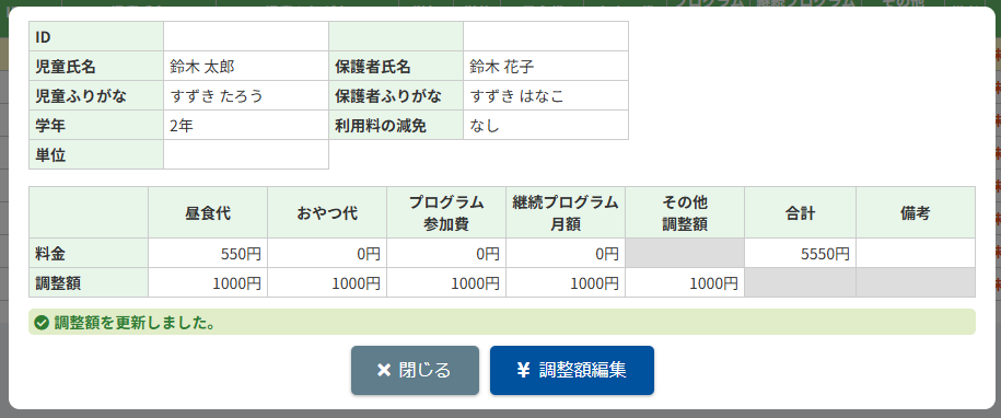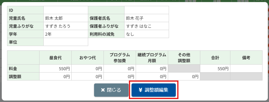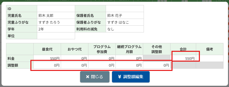 HOME > 入退室履歴 > 請求金額を編集する 請求金額を編集する 「請求金額を編集する」とは… 何か特別な事情があった場合などに、請求金額を児童毎に調整することができる機能です。 ここでは、請求金額を調整する機能の確認ができます。 1.請求情報画面を開く 入退室履歴画面の右上にある【請求情報】ボタンを押してください。 2.請求金額を調整したい年度と月を選択する 画面左上にある年度リストと月リストから請求金額を調整したい年月度を選択してください。 3.請求金額を調整したい児童を選択する 請求金額を調整したい児童をクリックしてください。 4.請求金額を調整する 【調整額編集】ボタンを押して該当の料金に調整額を入力してください。 調整額の入力が完了しましたら、保存するボタンを押してください。 正しく調整額が適用されていることを確認してください。 調整額で料金を変更した児童は背景が黄色になります。 利用料を確定する ≫