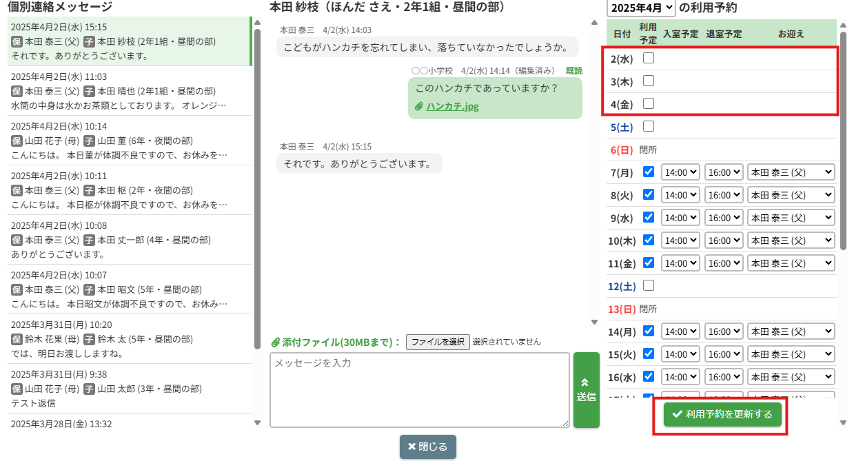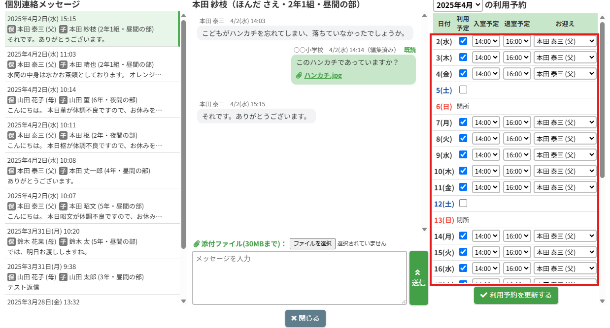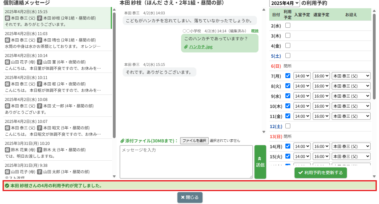 HOME > 個別連絡メッセージ > 児童の利用予約を変更 児童の利用予約を変更 1.現在の予約状況を表示 保護者が予約を入れていた際、個別連絡画面からも予約状況が確認できます。 内容を変更したい場合、【利用予定】、【入室予定】、【退室予定】、【お迎え】を変更できます。また、プログラムの申し込み(アフタースクール:体験プログラム・継続プログラム)や昼食予約も可能です。 2.利用予約の更新完了 変更を行い、【利用予約を更新する】をクリックすることで更新されます。 更新された際、下記のように表示されます。