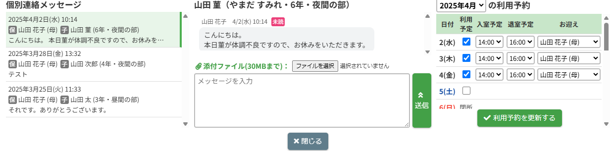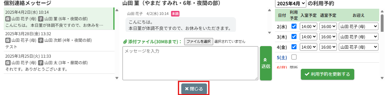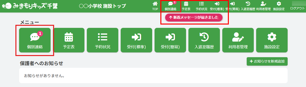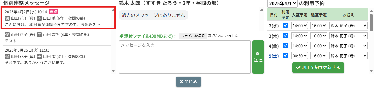 HOME > 個別連絡メッセージ > メッセージを確認する メッセージを確認する 「メッセージを確認する」では保護者から送られた個別連絡メッセージを確認する機能、及び未読の新着メッセージの通知について機能の確認ができます。 1.新着メッセージの通知 保護者から送られた未読の新着メッセージがある場合、トップ画面及び画面上部の【個別連絡】に通知され、「新着メッセージが届きました」というメッセージが表示されます。 個別連絡メッセージを確認するには【個別連絡】をクリックしてください。 2.メッセージスレッドを表示する 【個別連絡】をクリックすると個別連絡メッセージがポップアップで表示されます。 児童別にメッセージのやり取りが行われるため、児童別の個別連絡メッセージスレッドが作成されます。 メッセージスレッド一覧には保護者の名前(続柄)と児童の名前(年組)と最新のメッセージのやりとりの一部が表示されます。 確認したい児童のメッセージスレッドをクリックしてください。 3.メッセージを確認する メッセージスレッドをクリックすると、その児童に関する連絡メッセージが表示されます。 表示しているメッセージはメッセージスレッド欄の色が変わります。 ここから過去のやり取りの確認や、メッセージの返信ができます。 メッセージにはそれぞれ「送信者の名前」と「送信日時」が表示されます。 4.個別連絡メッセージを閉じる 下部の【閉じる】ボタンをクリックすることで個別連絡メッセージのポップアップを閉じることができます。 メッセージの返信 ≫