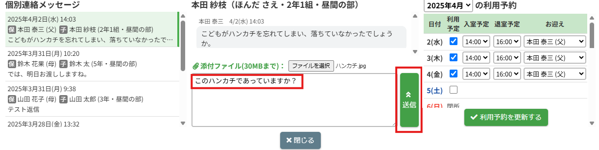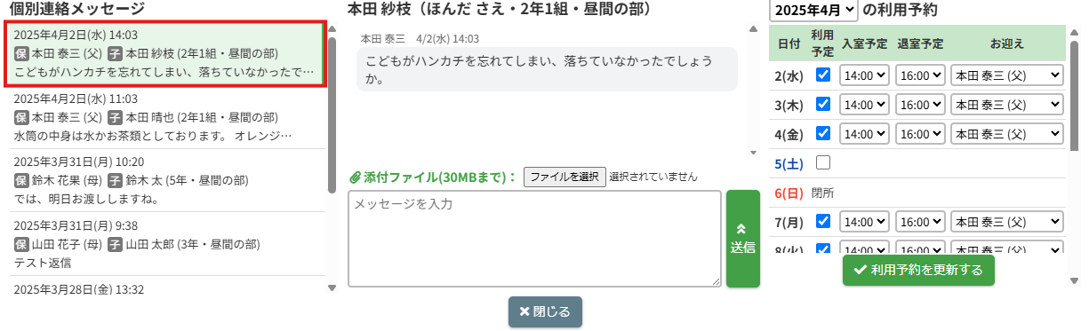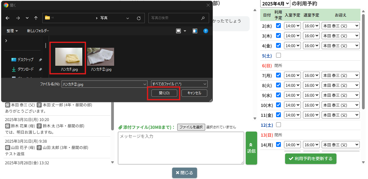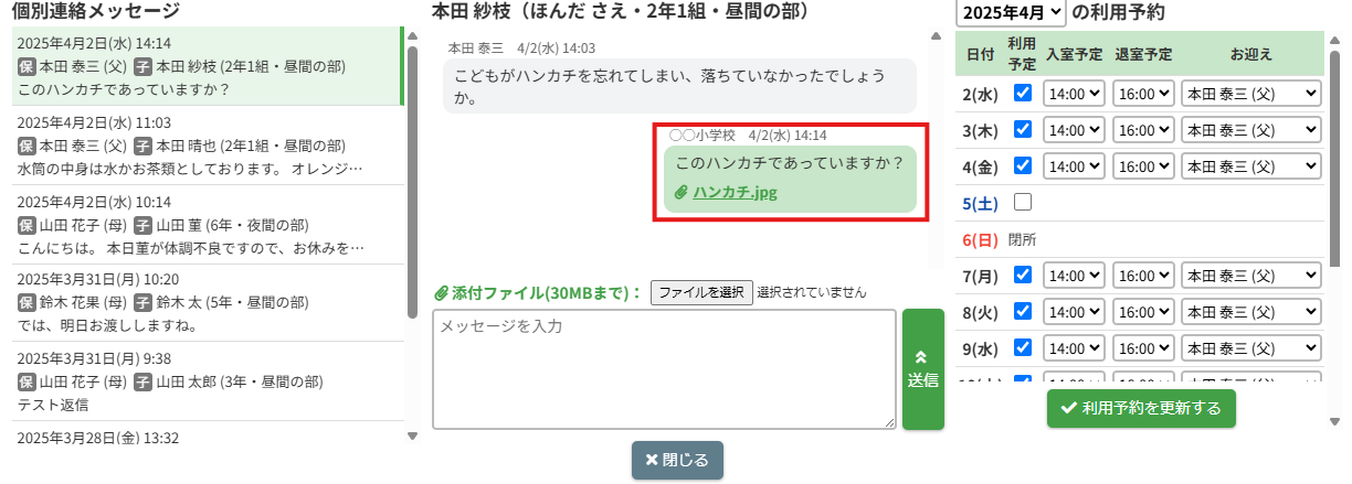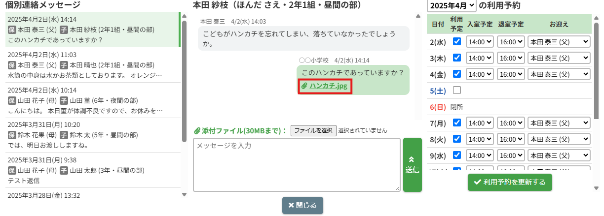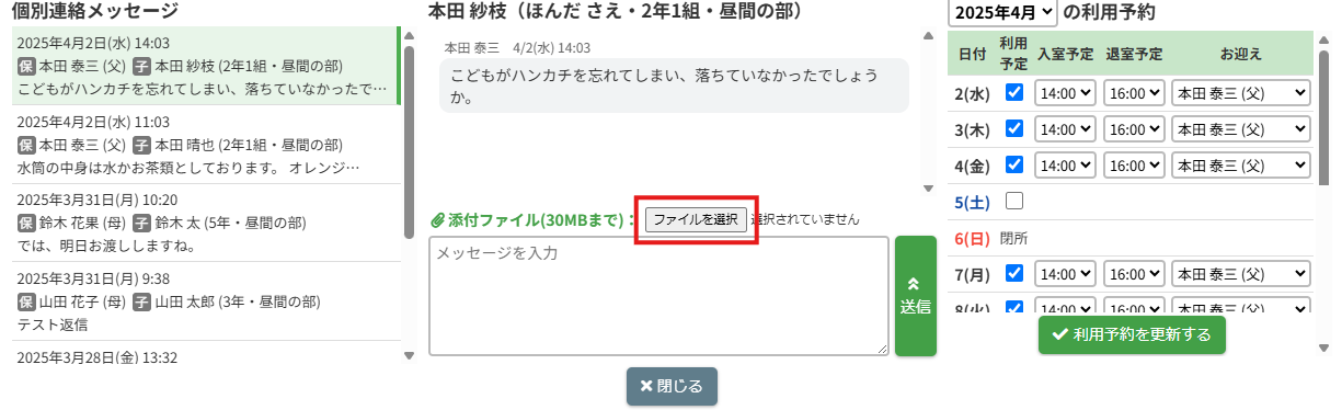 HOME > 個別連絡メッセージ > 添付ファイルを送信する 添付ファイルを送信する 1.メッセージスレッドを表示する 【個別連絡】ボタンをクリックすると個別連絡メッセージがポップアップで表示されます。 確認したい児童のメッセージスレッドをクリックしてください。 2.添付ファイルを送信する 【ファイルを選択】ボタンをクリックすると、ファイル選択画面が表示されます。 3.添付したファイルを選択 対象ファイルを選択してファイルを開きます。 4.メッセージを追加して送信 送信したいメッセージの内容を【メッセージを入力】欄へ入力し、【送信】ボタンをクリックしてください。 (添付ファイルを送信する場合は何らかのメッセージを追加してください) 5.送信したメッセージの確認 メッセージの下に送信したファイル名が表示されます。 6.添付したファイルの確認 ファイル名をクリックするとファイル画像が表示されます。 (画像以外の場合はファイル名をクリックした時点でダウンロードされます。) 【閉じる】ボタンをクリックすると画像が閉じられ、【画像をダウンロード】をクリックするとダウンロードが可能です。 メッセージの編集 ≫