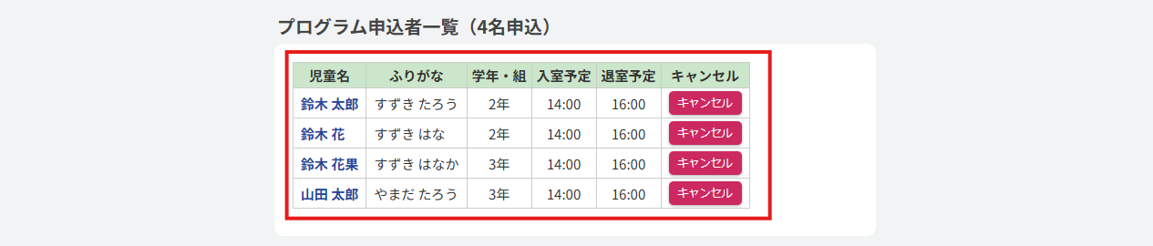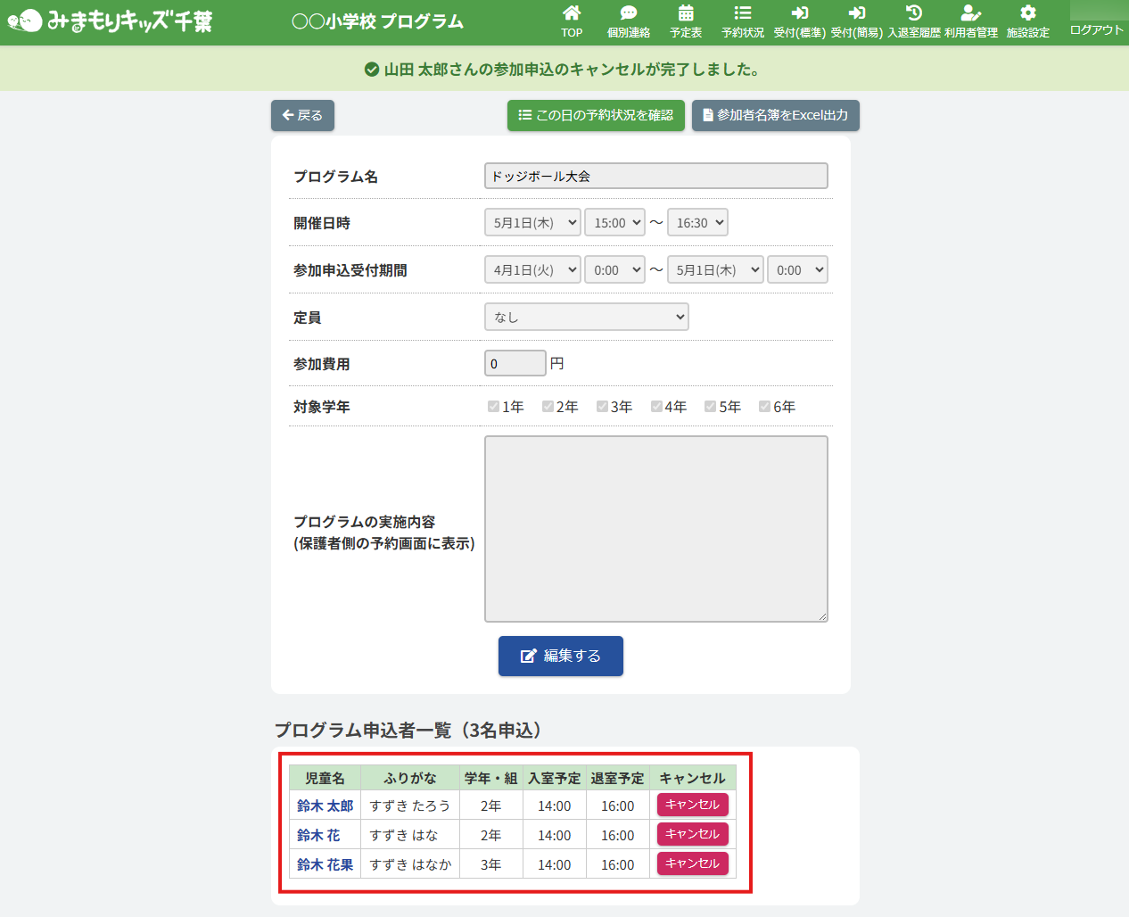 HOME > 予定表 > プログラム申込者のキャンセルを行う(子どもルーム) プログラム申込者のキャンセルを行う(子どもルーム) 「プログラム申込者のキャンセルを行う」では、プログラムに申し込んだ児童のキャンセルを施設側で編集する機能の確認ができます。※プログラム「定員」でいずれかを選択すると、表記がそれぞれ異なります。定員制限が無く、プログラム「定員」で「なし」を選択した場合、【編集する】ボタンは表示されず、児童のキャンセルのみが可能になります。 1.プログラム内容の確認画面を開く プログラムを登録した日にちのカレンダー欄から【プログラム名称】ボタンをクリックしてください。(例:ドッジボール大会) 2.プログラム申込者の更新を行う 画面下部にある「プログラム申込者一覧」で児童のキャンセルを行うことができます。キャンセルしたい児童を選び、【キャンセル】ボタンをクリックしてください。 3.プログラム申込者のキャンセルを完了する 画面上部に表示されるアナウンスとプログラム申込者の人数が更新されていることをご確認ください。 プログラムの自動締切を設定する(子どもルーム)≫