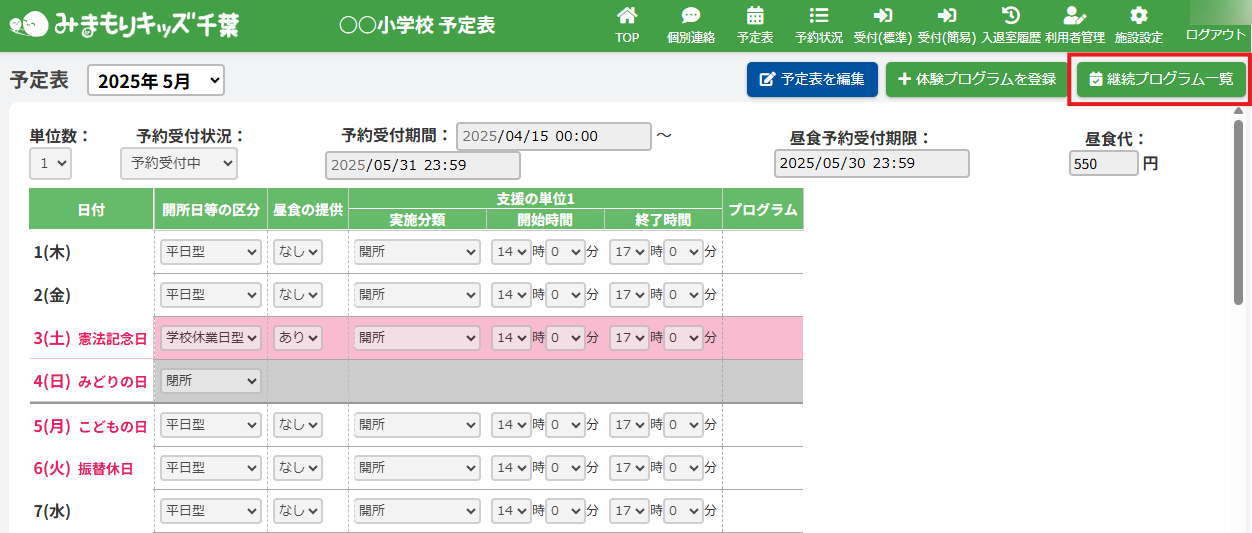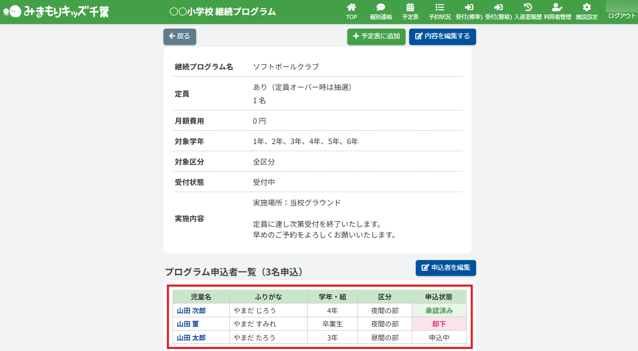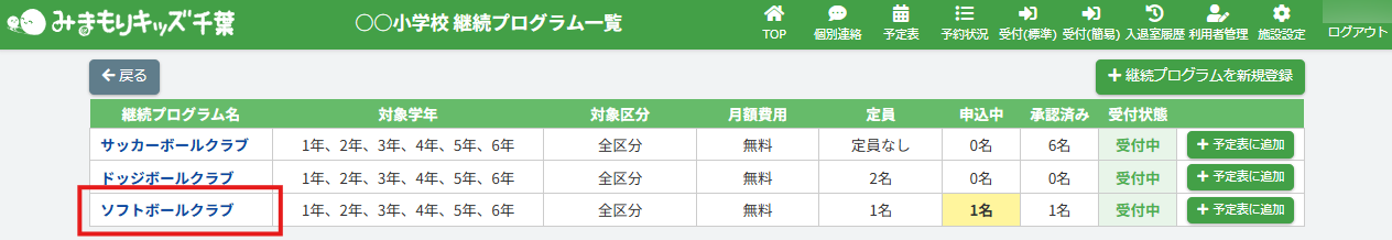 HOME > 予定表 > 継続プログラム所属申込者・所属者の申込状況を確認する(アフタースクール) 継続プログラム所属申込者・所属者の申込状況を確認する(アフタースクール) 「継続プログラム所属申込者・所属者の申込状況を確認する」では、登録した継続プログラムの児童の所属申込み・所属状況の確認方法ができます。 1.継続プログラム内容の確認画面を開く 画面上部にある【継続プログラム一覧】ボタンをクリックしてください。※子どもルームとアフタースクールとではボタンの表示が異なります。子どもルームの場合は、【継続プログラム一覧】ボタンは表示されません。 2.継続プログラム詳細画面を開く 編集したい継続プログラムを選び、クリックしてください。 3.所属申込者・所属者を確認する 継続プログラム詳細の下部に所属申込み・所属している児童の一覧が表示されます。※継続プログラムにより定員制限で抽選を行うことがあります。抽選結果で「却下」となった児童のステータスも表記されます。 継続プログラム所属申込者の承認を行う(アフタースクール)≫ 継続プログラム申込者の抽選を行う(アフタースクール)≫