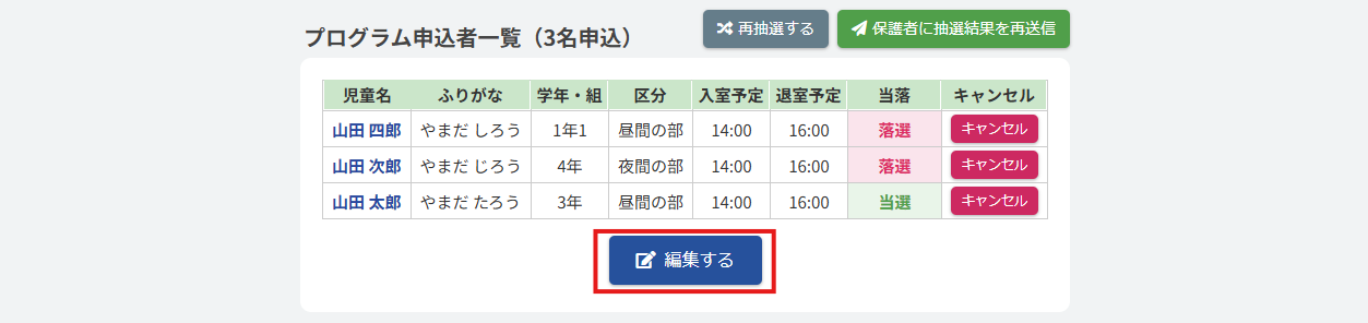 手動で抽選を行うこともできます。抽選を行う際は、【編集する】ボタンをクリックしてください。