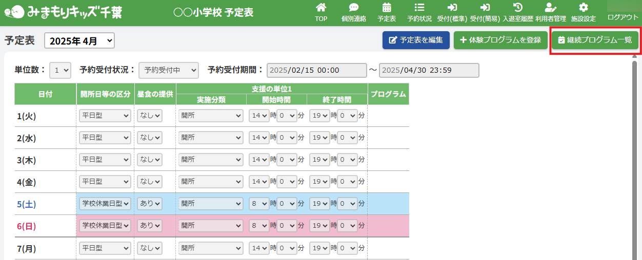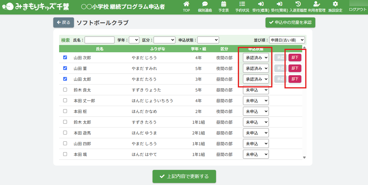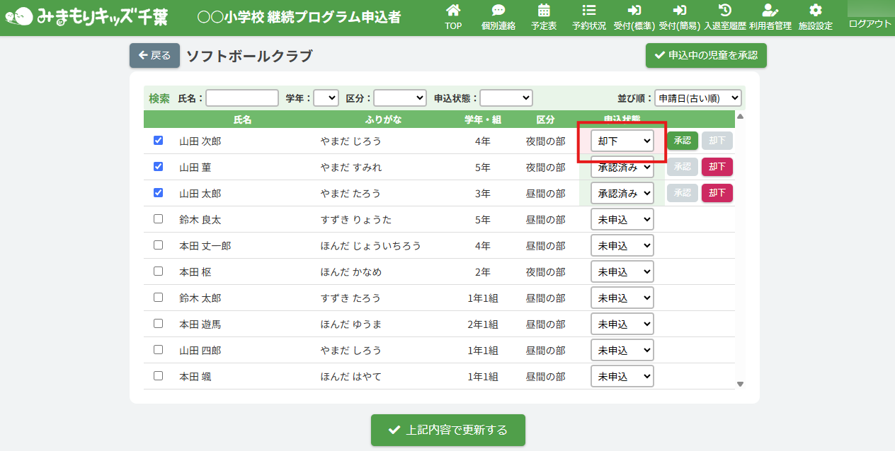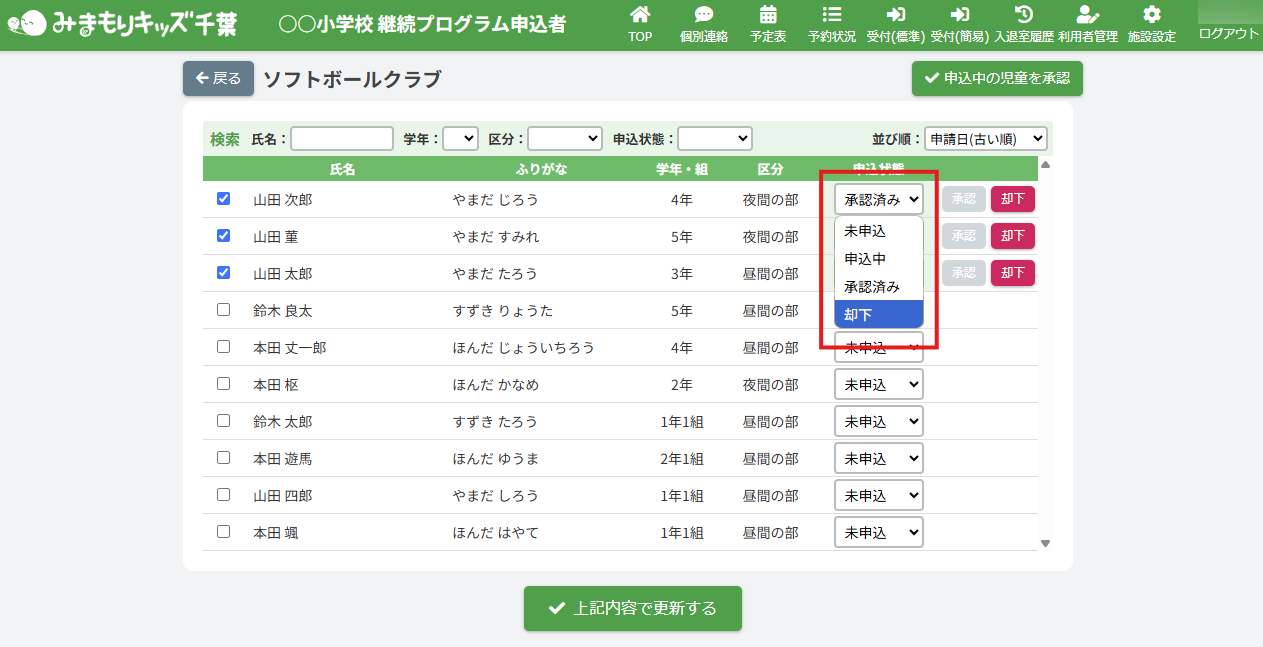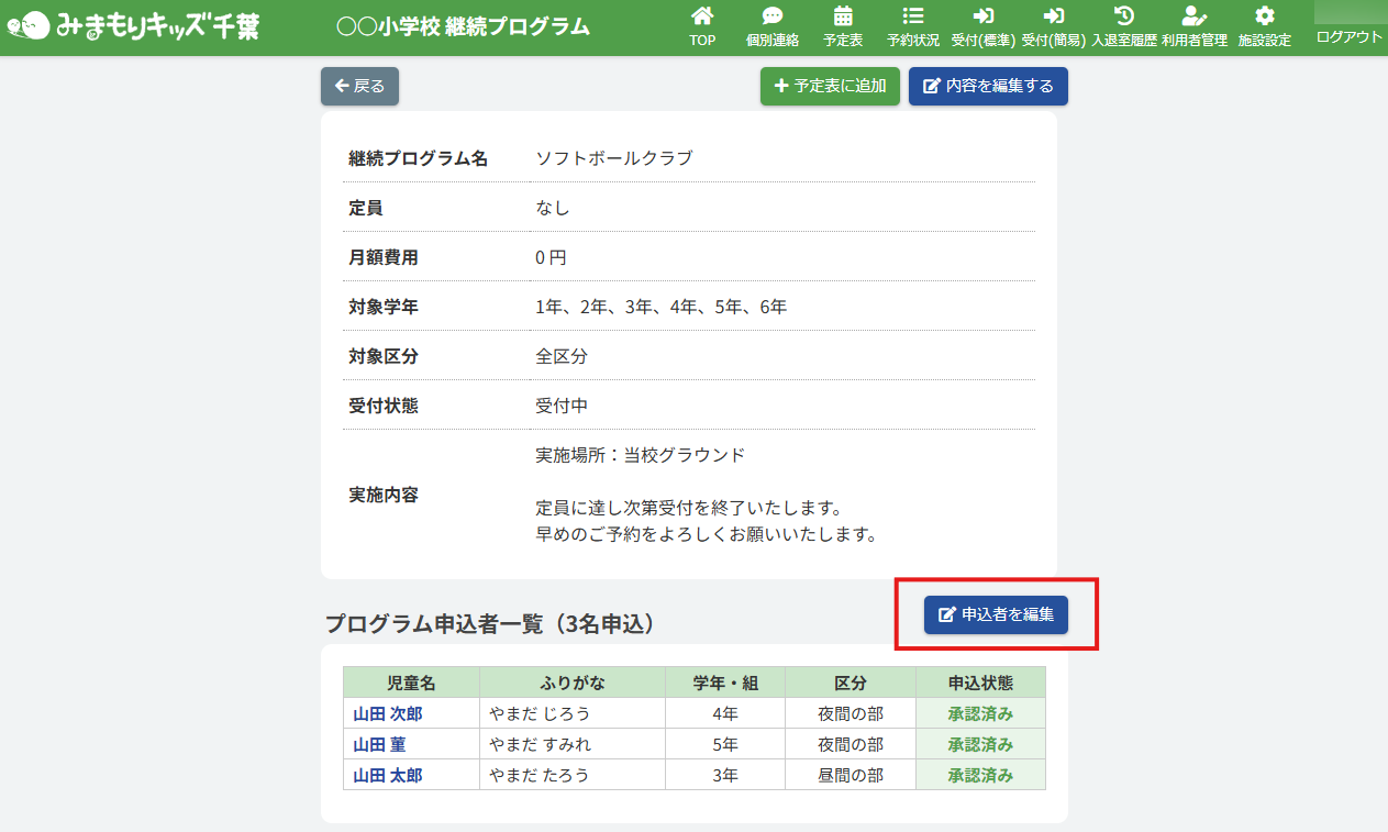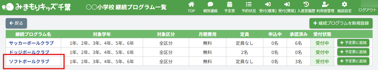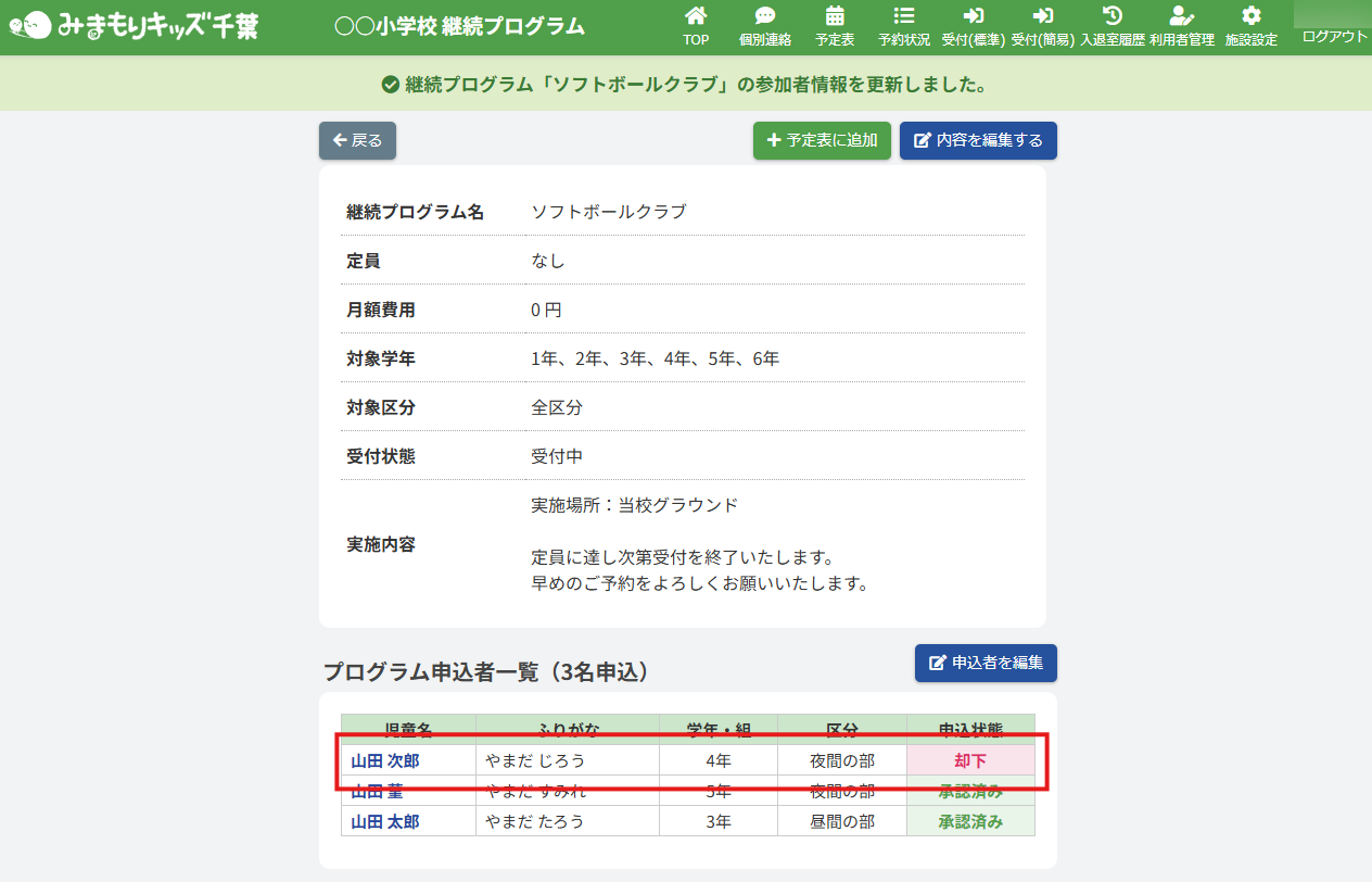 HOME > 予定表 > 継続プログラム所属申込者の却下を行う(アフタースクール) 継続プログラム所属申込者の却下を行う(アフタースクール) 「継続プログラム所属申込者の却下を行う」では、プログラムに所属申込みを行った児童の却下を施設側で編集する機能の確認ができます。※継続プログラム申込者画面での手動選択となります。児童を「却下」する際は、やむを得ない事情などにより設定するものになります。 1.継続プログラム内容の確認画面を開く 画面上部にある【継続プログラム一覧】ボタンをクリックしてください。※子どもルームとアフタースクールとではボタンの表示が異なります。子どもルームの場合は、【継続プログラム一覧】ボタンは表示されません。 2.継続プログラム詳細画面を開く 編集したい継続プログラムを選び、クリックしてください。 3.プログラム所属申込者を編集する 継続プログラム詳細の下部に所属申込みをしている児童の一覧が表示されます。画面右下にある【申込者を編集】をクリックしてください。 4.プログラム所属申込者の抽選を実行する クリックすると継続プログラム申込者画面が表示されます。「申込状態」の右横にある【却下】ボタンをクリックしてください。「申込状態」の選択欄で【却下】を手動で選択することも可能です。 5.更新を実行する 【上記内容で更新する】ボタンをクリックして、入力した内容で更新します。 6.プログラム所属申込者の却下を完了する 画面上部に表示されるアナウンスとプログラム所属申込者のステータスが更新されていることをご確認ください。 継続プログラムの所属者締切を設定する(アフタースクール)≫