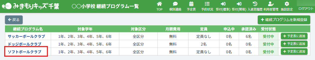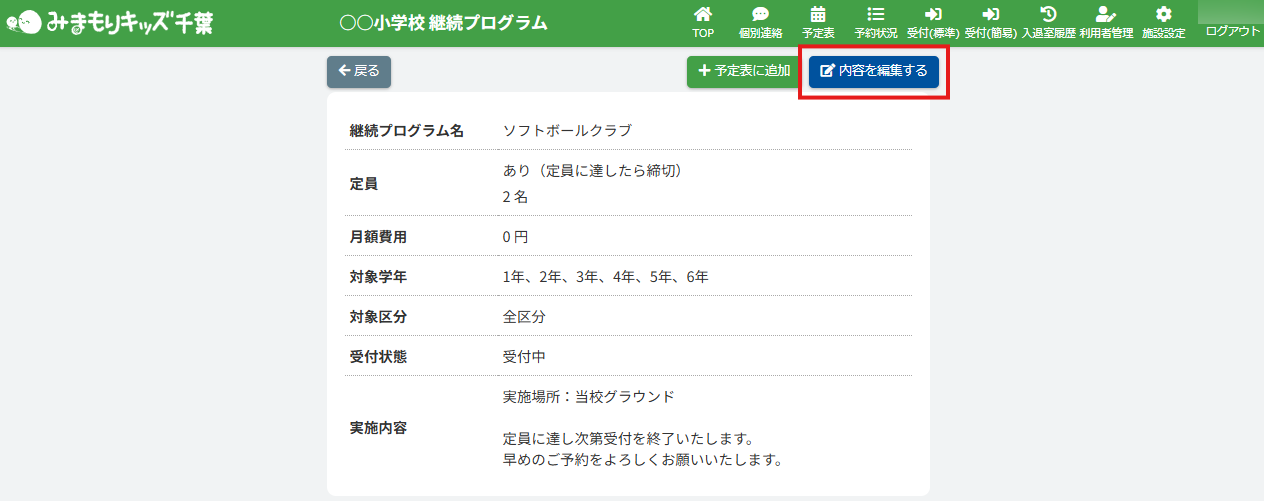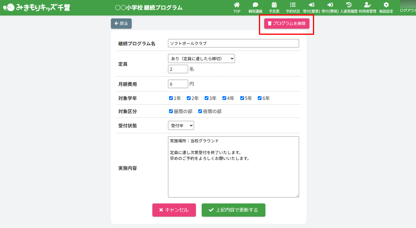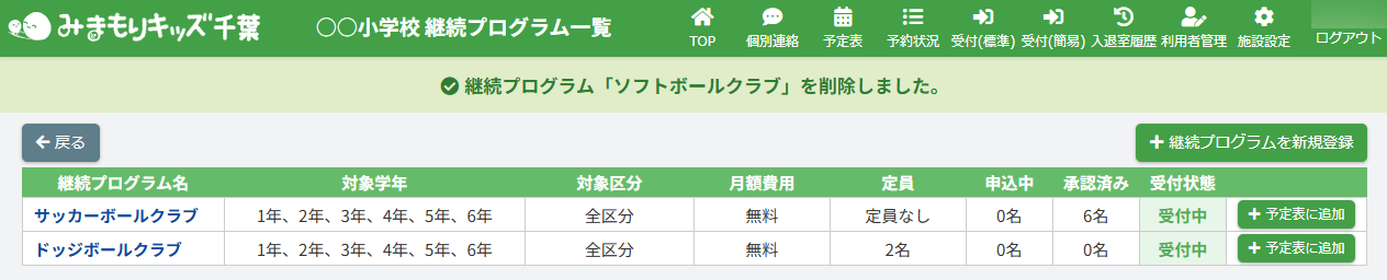 HOME > 予定表 > 所属継続プログラムを削除する(アフタースクール) 所属継続プログラムを削除する(アフタースクール) 「所属継続プログラムを削除する」では、登録した体験プログラムを削除する機能の確認ができます。 1.継続プログラム内容の確認画面を開く 画面上部にある【継続プログラム一覧】ボタンをクリックしてください。※子どもルームとアフタースクールとではボタンの表示が異なります。子どもルームの場合は、【継続プログラム一覧】ボタンは表示されません。 2.継続プログラム詳細画面を開く 削除したい継続プログラムを選び、クリックしてください。 3.継続プログラム編集フォームを開く 【内容を編集する】ボタンをクリックしてください。 4.削除を実行する 画面上部にある【このプログラムを削除する】ボタンをクリックしてください。 その後下記のアラートが表示されます。 【OK】を押すと継続プログラムが削除されます。【キャンセル】を押すと操作が取り消されます。 4.継続プログラムの削除の完了 画面上部に表示されるアナウンスを確認してください。 継続プログラム所属申込者・所属者の申込状況を確認する(アフタースクール)≫