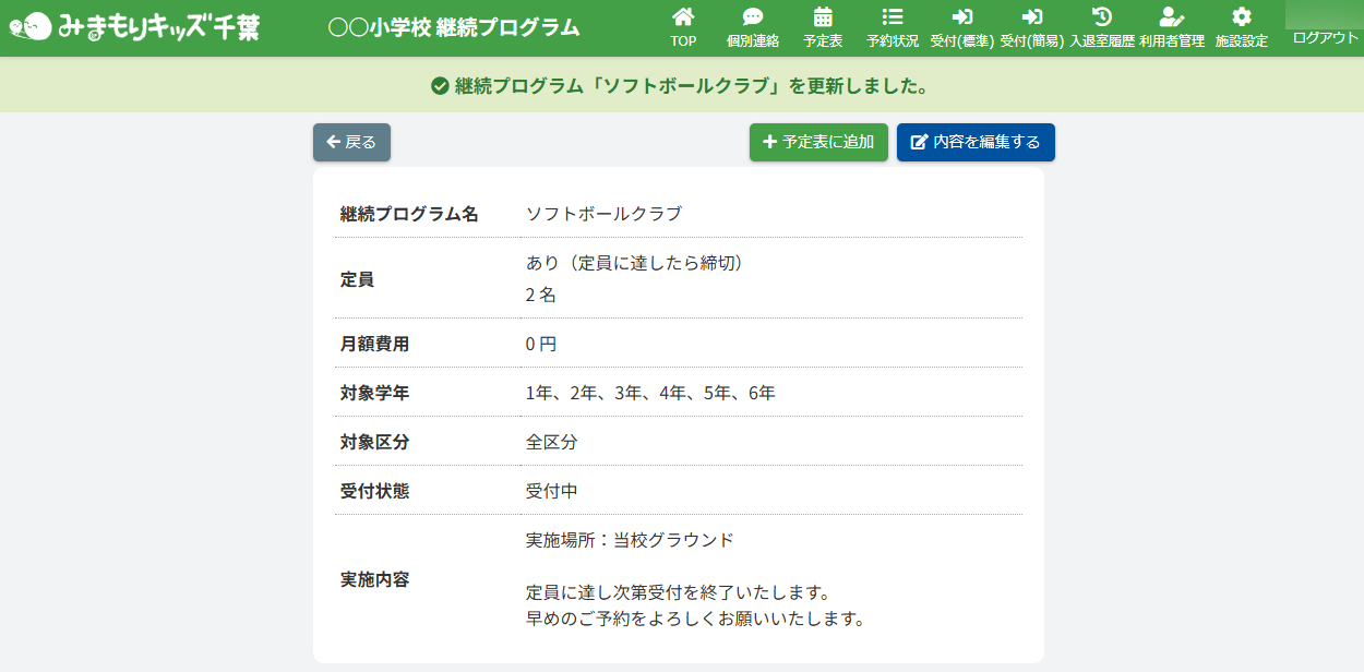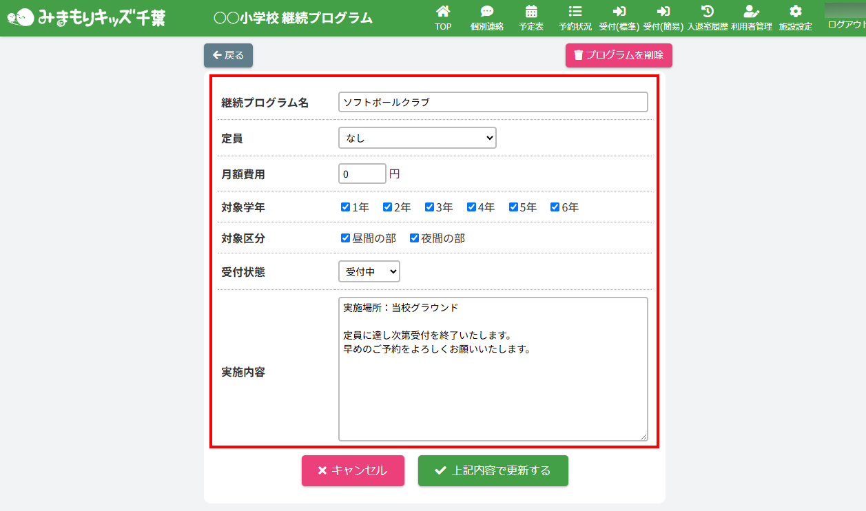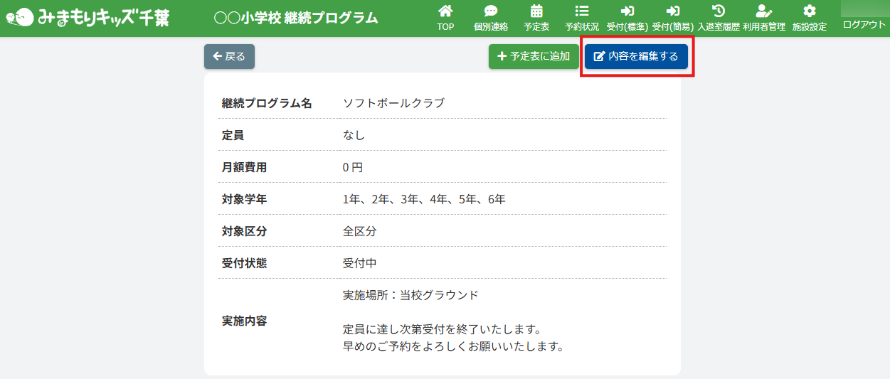 HOME > 予定表 > 所属継続プログラムを編集する(アフタースクール) 所属継続プログラムを編集する(アフタースクール) 「所属継続プログラムを編集する」では、登録したプログラムの内容を編集する機能の確認ができます。 1.継続プログラム内容の確認画面を開く 画面上部にある【継続プログラム一覧】ボタンをクリックしてください。※子どもルームとアフタースクールとではボタンの表示が異なります。子どもルームの場合は、【継続プログラム一覧】ボタンは表示されません。 2.継続プログラム詳細画面を開く 編集したい継続プログラムを選び、クリックしてください。 3.継続プログラム編集フォームを開く 【内容を編集する】ボタンをクリックしてください。 3.登録内容を変更する 各項目に沿って変更したい内容を入力、選択してください。 ※プログラム詳細はアフタースクールと子どもルームで画面が一部異なります。※「対象区分」はアフタースクールのみ表示 4.更新を実行する 【上記内容で更新する】ボタンをクリックして、入力した内容で更新します。 5.編集の完了 画面上部に表示される更新のアナウンスを確認してください。 所属継続プログラムを削除する(アフタースクール) ≫