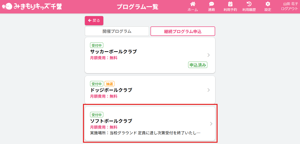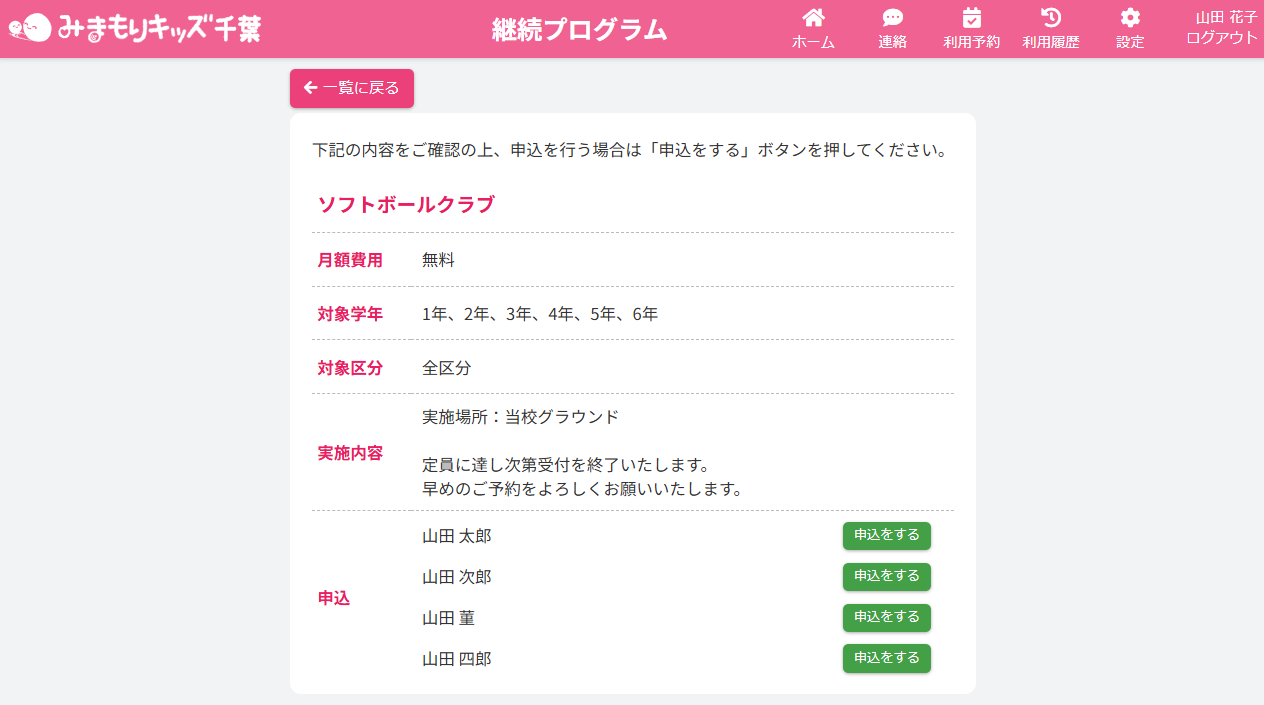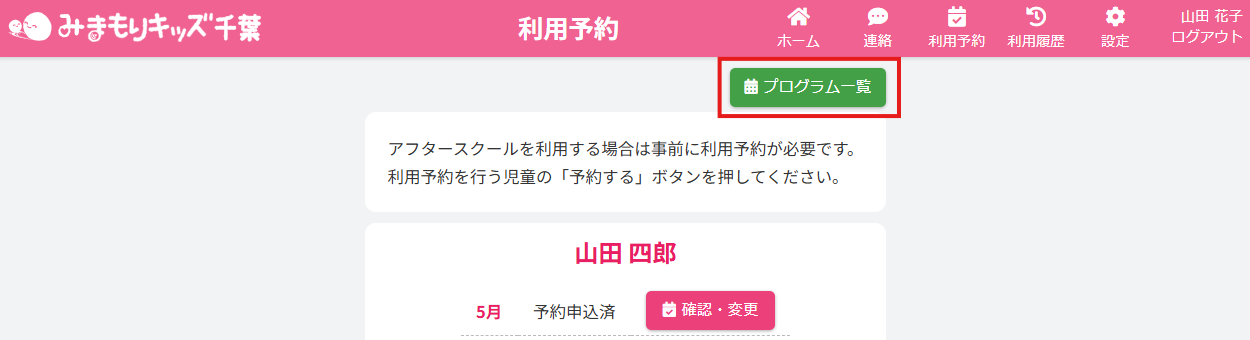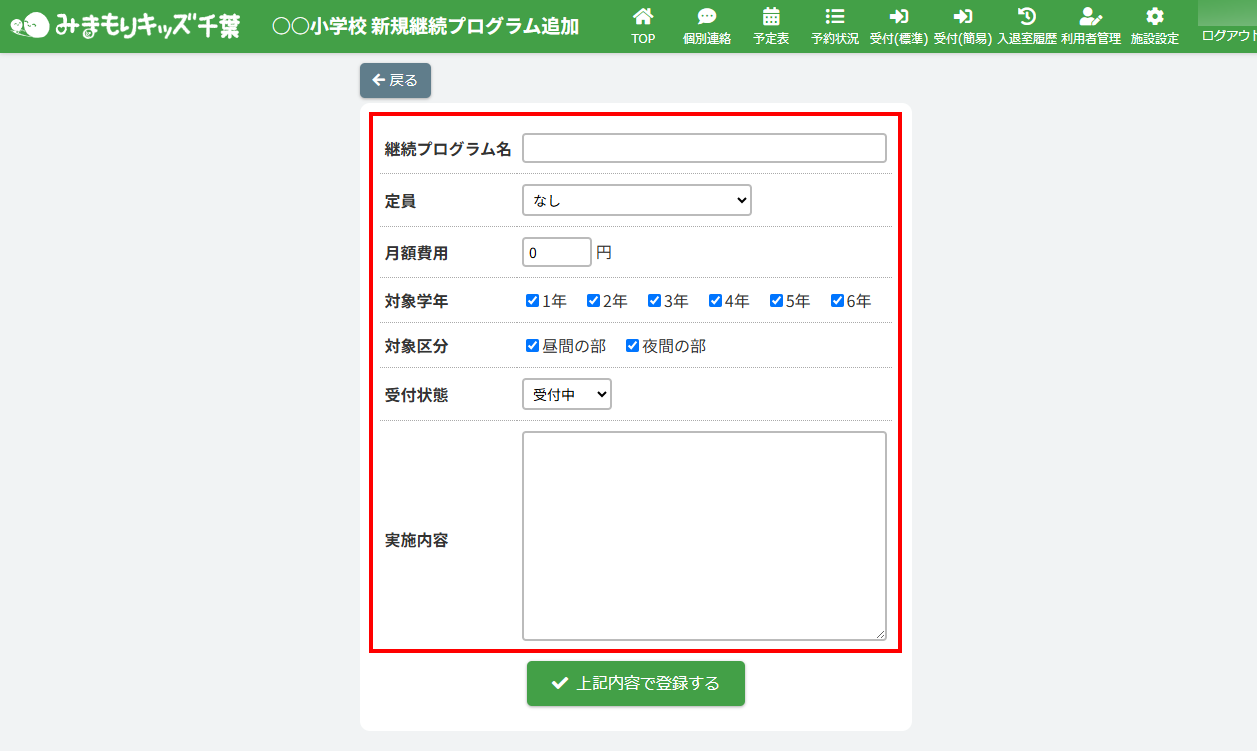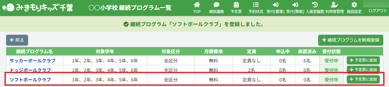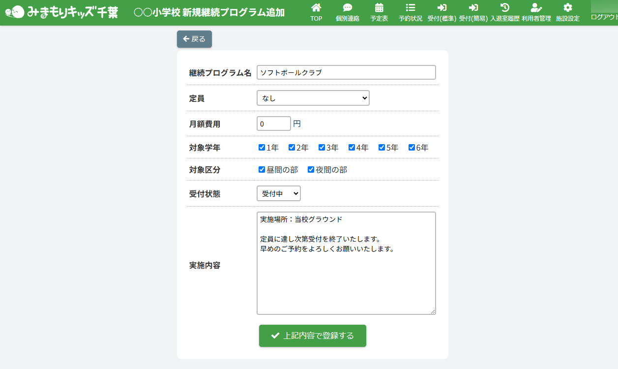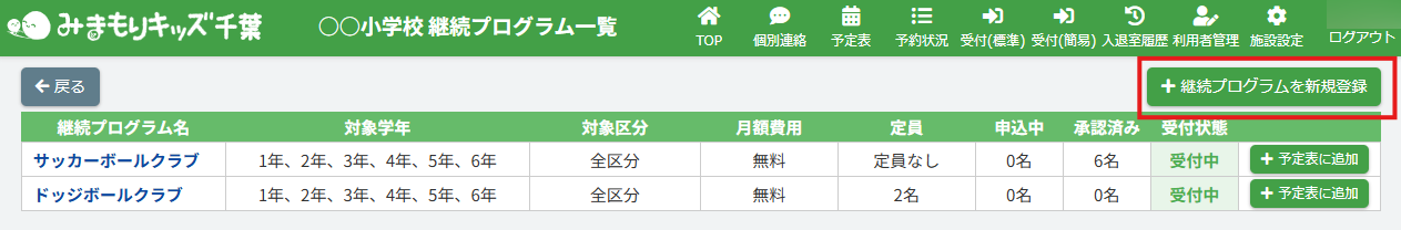 HOME > 予定表 > 所属継続プログラムを登録する(アフタースクール) 所属継続プログラムを登録する(アフタースクール) 「プログラム」とは…施設が設定したイベント・レクリエーションを指します。開催時間・定員・参加費用等の各種設定ができます。 参加した児童はシステム上でプログラムの参加費用が計算されます。 ここではプログラムの登録機能の確認ができます。 1.継続プログラム一覧画面を開く 画面上部にある【継続プログラム一覧】ボタンをクリックしてください。※子どもルームとアフタースクールとではボタンの表示が異なります。子どもルームの場合は、【継続プログラム一覧】ボタンは表示されません。 2.継続プログラム新規登録画面を開く 画面上部にある【継続プログラムを新規登録】ボタンをクリックしてください。 3.新規継続プログラム内容を入力する 実施するプログラムについて項目に沿って内容を入力してください。 ※子どもルームとアフタースクールとではプログラム追加画面の表示が異なります。子どもルームの場合…「対象区分」は表示されません。 4.新規継続プログラムの登録を実行する 【上記内容で登録する】ボタンをクリックしてください。 5.登録の完了 画面上部に表示されるアナウンスを確認してください。 <保護者側画面(プログラム一覧画面)> プログラム一覧画面でも追加されたプログラムの確認ができます。 ※利用予約画面には、継続プログラムに所属している児童以外は、継続プログラムが表示されません。 【プログラム一覧】をクリックすると、今までに追加されたプログラムの一覧が表示されます。 「継続プログラム申込」の一覧から詳細を閲覧したい継続プログラムをクリックしてください。 プログラムの詳細を見ることができます。 所属継続プログラムを編集する(アフタースクール) ≫