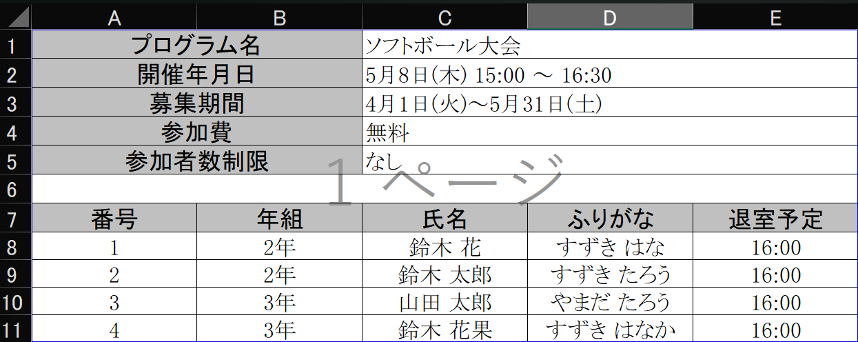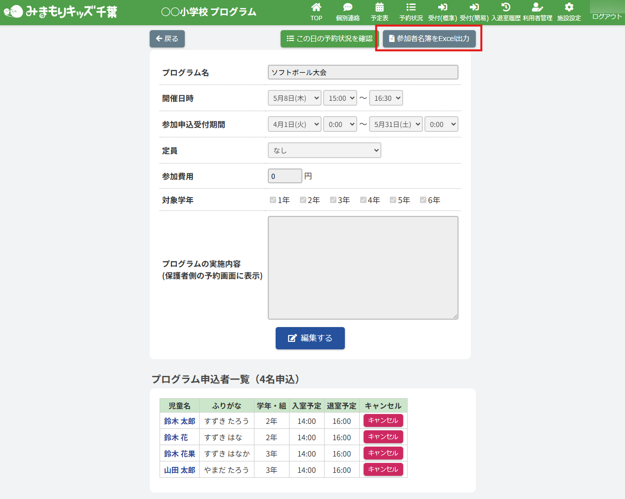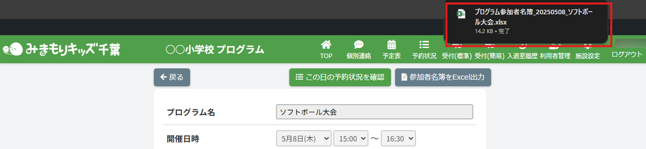 HOME > 予定表 > プログラム参加者名簿を出力する(子どもルーム) プログラム参加者名簿を出力する(子どもルーム) 「プログラム参加者名簿を出力する」では、プログラムに参加する予定の児童情報を名簿で出力できる機能の確認ができます。 1.プログラム内容の確認画面を開く プログラムを登録した日にちのカレンダー欄から【プログラム名称】ボタンをクリックしてください。(例:ソフトボール大会) 2.参加者名簿の出力を実行する 画面上部にある【参加者名簿をExcel出力】ボタンをクリックしてください。 3.出力されたExcelデータを開く 出力されたデータのダウンロード画面が表示されます。ファイルをダウンロードし、画面上部に表示されたダウンロードファイルをクリックしてExcelデータを開いてください。