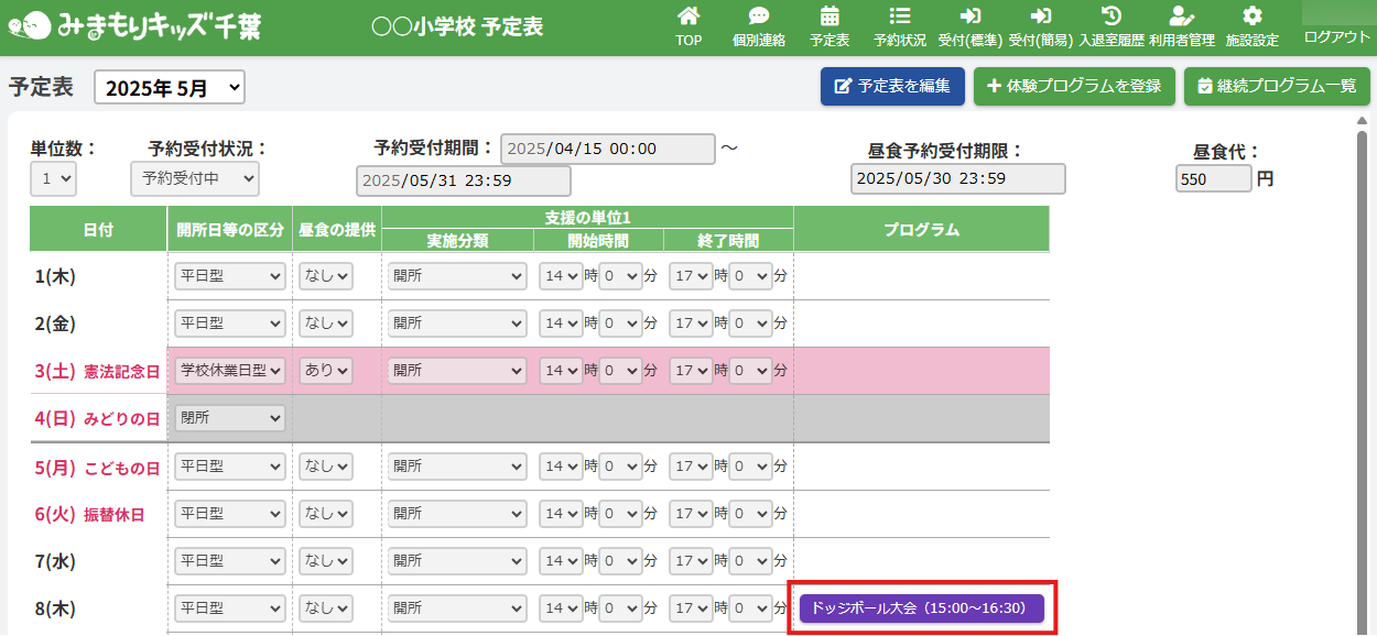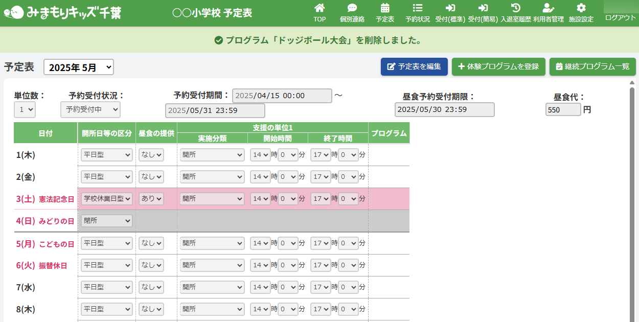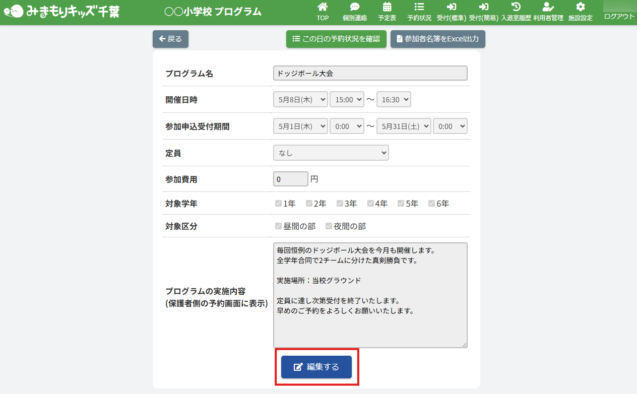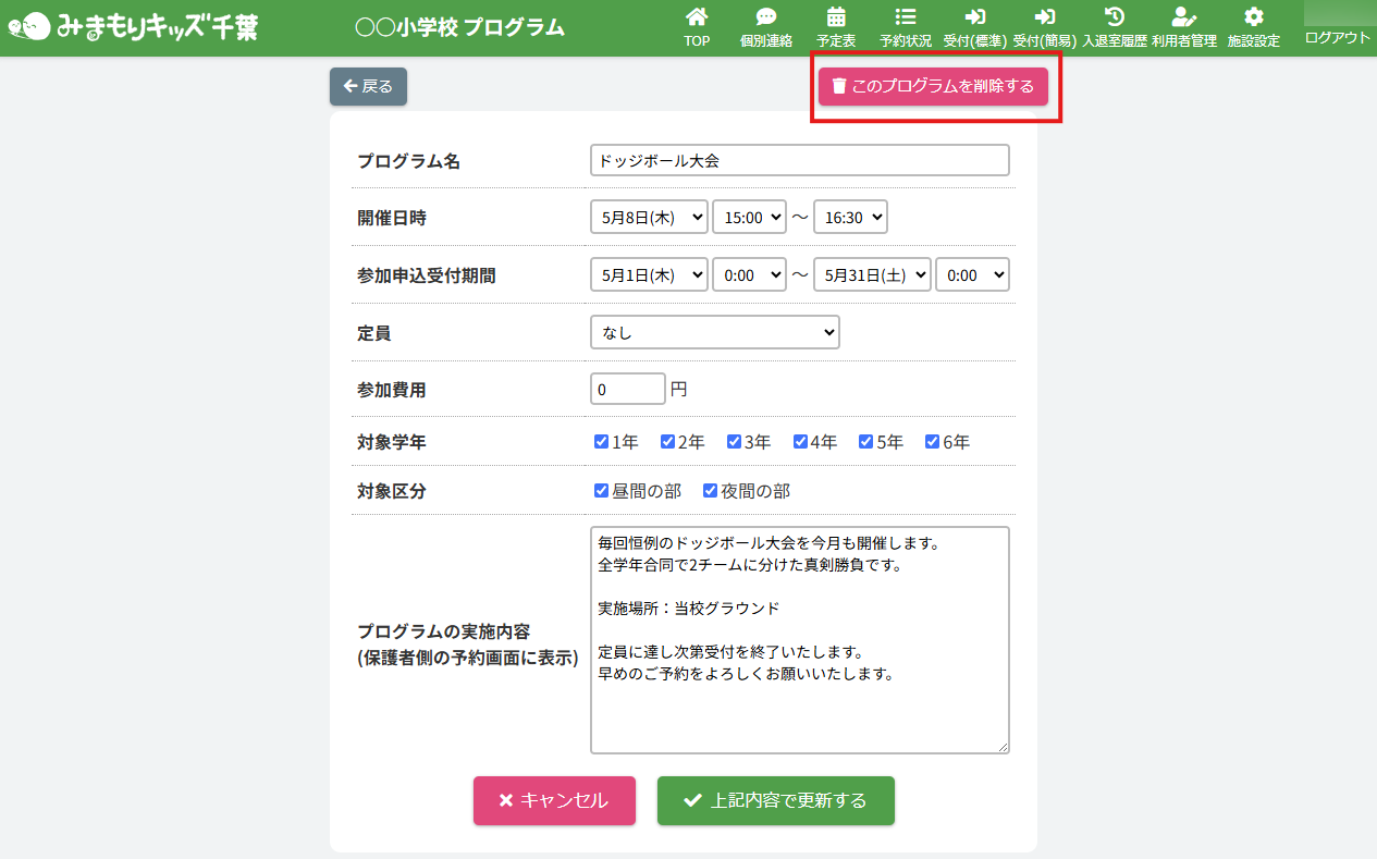 HOME > 予定表 > 体験プログラムを削除する(アフタースクール) 体験プログラムを削除する(アフタースクール) 「体験プログラムを削除する」では、登録した体験プログラムを削除する機能の確認ができます。 1.体験プログラム内容の確認画面を開く 予定表から編集したい【体験プログラム名称】ボタンをクリックしてください。(例:ドッジボール大会) 紫のボタン:体験プログラムオレンジのボタン:継続プログラム 2.体験プログラム編集フォームを開く 画面下部にある【編集する】ボタンをクリックしてください。 3.削除を実行する 画面上部にある【このプログラムを削除する】ボタンをクリックしてください。 その後下記のアラートが表示されます。 【OK】を押すと体験プログラムが削除されます。【キャンセル】を押すと操作が取り消されます。 4.体験プログラムの削除の完了 画面上部に表示されるアナウンスを確認してください。 体験プログラム申込者の申込状況を確認する(アフタースクール)≫