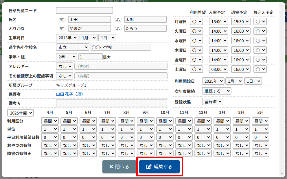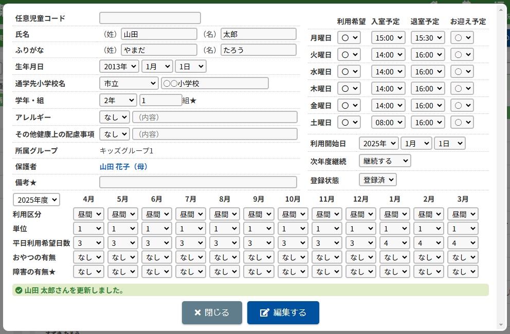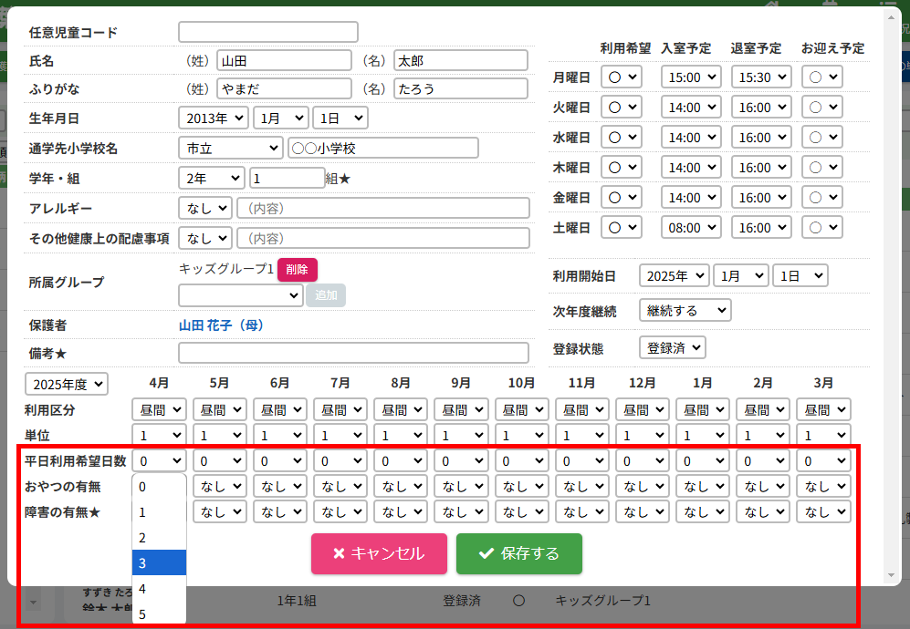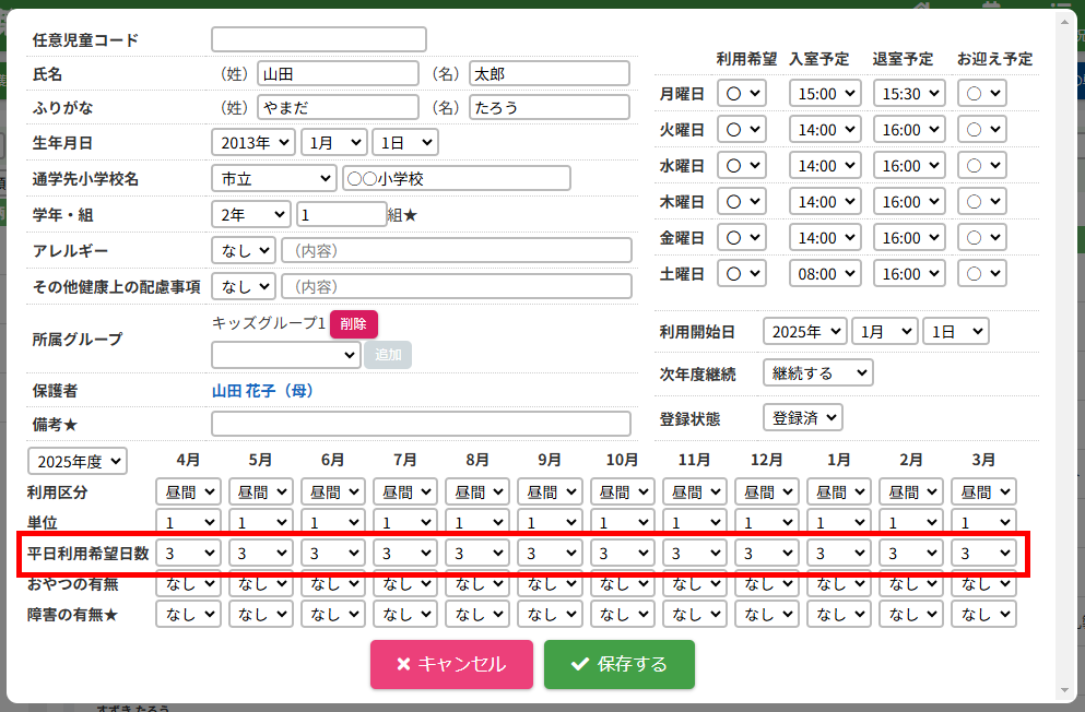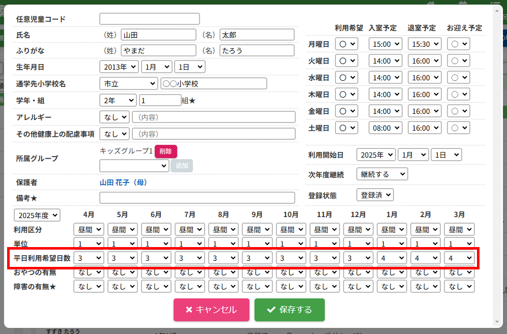 HOME > 利用者管理 > 平日利用希望曜日数を変更する 平日利用希望日数を変更する 「平日利用希望日数を変更する」では、児童の平日利用希望日数を変更する方法を確認できます。 児童の登録時に入力した平日の利用希望が平日利用希望日数として登録されますが、後から手動で変更することもできます。 ※対象児童数の計算や支援の単位の自動設定に関わります。ご注意ください。 1.児童編集フォームを開く 児童の一覧から平日利用希望日数を変更したい児童の氏名をクリックしてください。 2.児童の登録内容の編集を実行する 【編集する】ボタンをクリックして、次へ進みます。 3.平日利用希望日数を変更する 平日利用希望日数「1~5」を選択してください。月ごとに変更することができます。 変更した月とそれ以降に平日利用希望日数の設定が適用されます。 1月の平日利用希望日数を4日にした場合、2月、3月も4日になります。 ※利用希望を平日利用希望日数として算出するのは児童の登録時のみです。 4.変更を保存する 【保存する】ボタンをクリックして、次へ進みます。 5.変更の完了 【閉じる】ボタンをクリックして、平日利用希望日数の変更は完了です。 児童の利用を休止する ≫