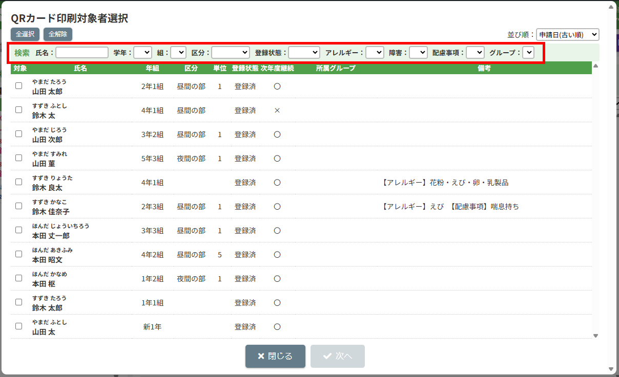 QRカード印刷対象者選択画面でも特定の児童を探す・選択するための検索・絞り込み機能があります。