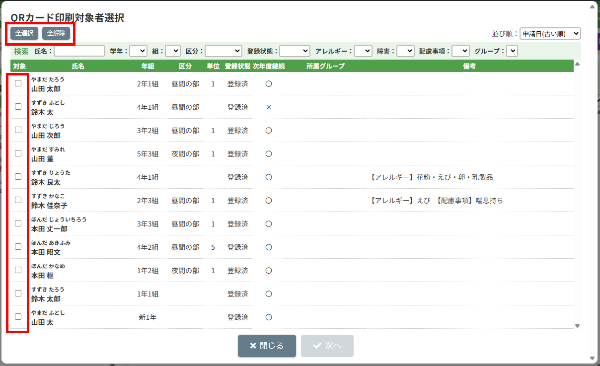 画面左上の【全選択】ボタンで表示中の児童全員の選択や、【全解除】ボタンで表示中の児童全員の選択が解除できます。