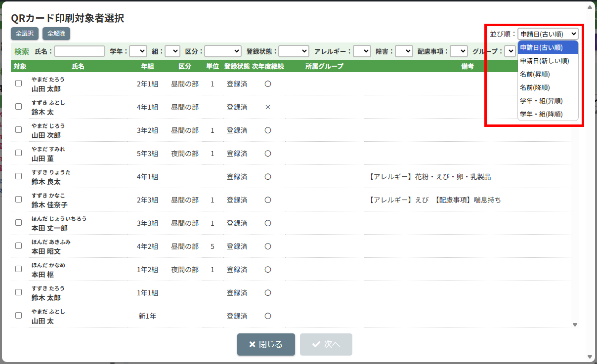 「申請日」「名前」「学年・組」の順番に並び替えることができます。