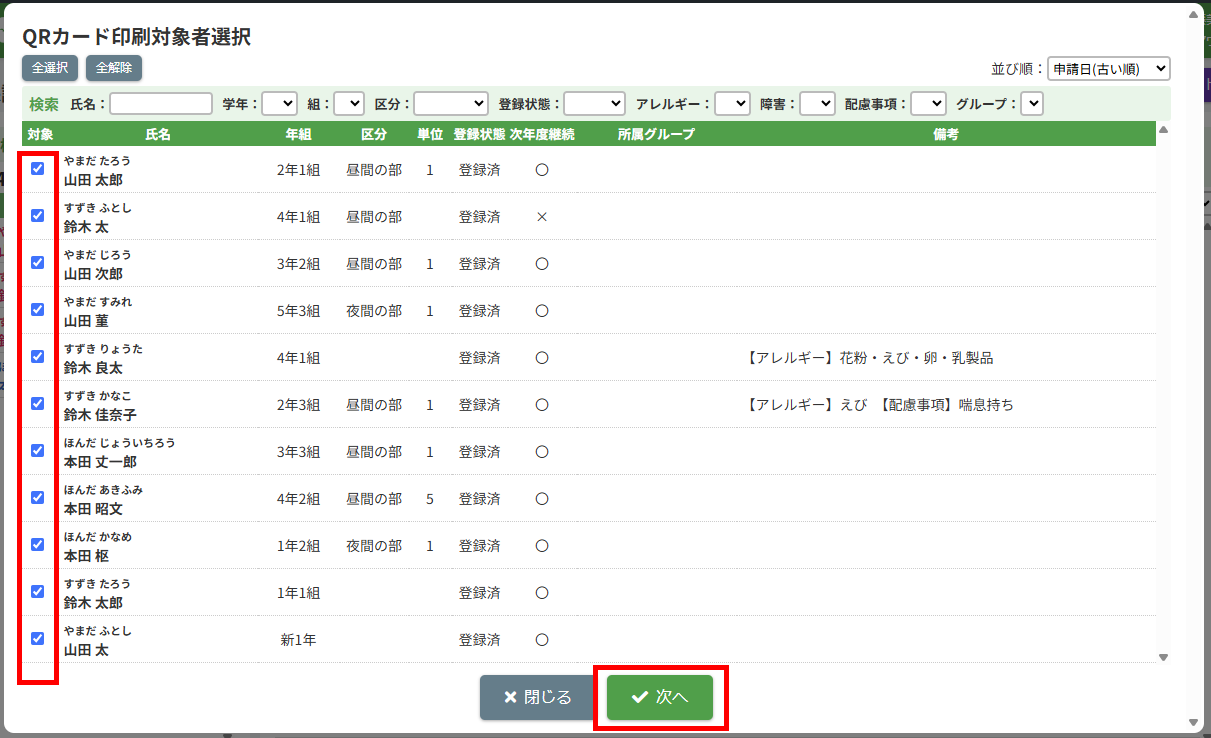 QRカードを作成したい児童をチェックボックスで選択してください。