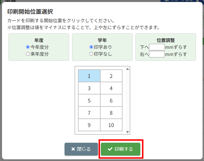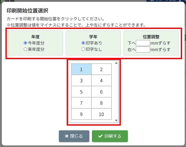 〇【年度】今年度分・来年度分、【学年】印字あり・印字なしのいずれかを選択してください。