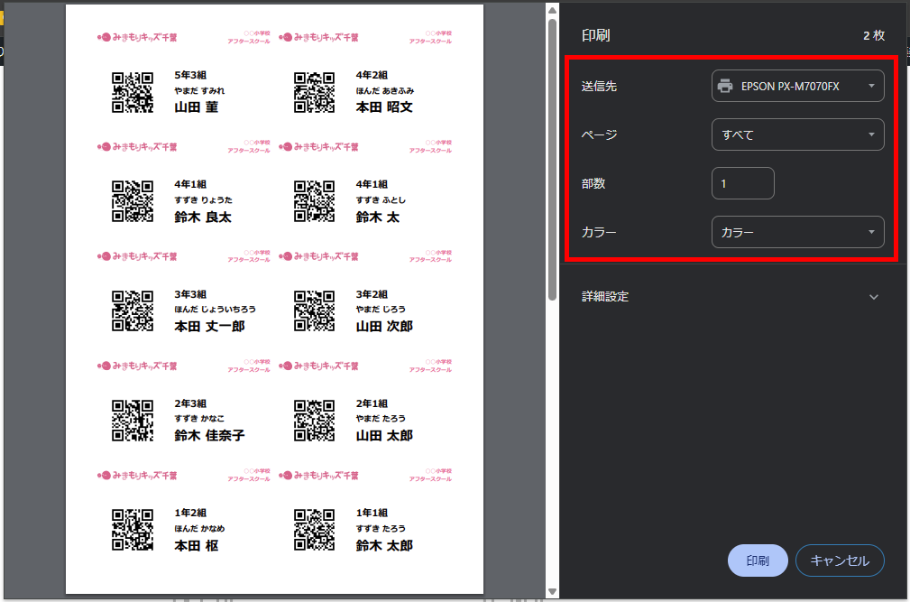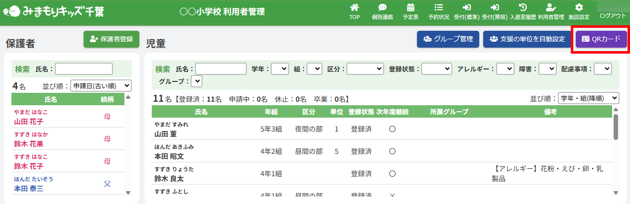 「QRカードを出力する」では、児童のQRカードを出力する機能の確認ができます。
