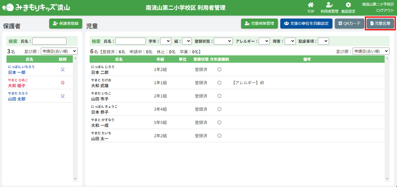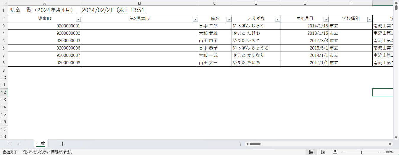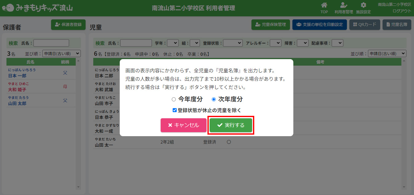 HOME > 利用者管理 > 児童名簿を出力する 児童名簿を出力する 「児童名簿を出力する」では、登録されている全児童の名簿をExcel形式で出力する機能の確認ができます。 ※児童の検索・絞り込み機能の利用に関わらず施設に登録されている全児童の名簿を出力します。 1.児童名簿出力フォームを開く 利用者管理画面の上部にある【児童名簿】ボタンをクリックしてください。 2.児童名簿出力を実行する 画面中央に児童名簿出力フォームが表示されます。 各選択項目を確認して【実行する】ボタンをクリックしてください。 ※1月~3月の場合、今年度と次年度の選択欄が表示されます。 ※【登録状態が休止の児童を除く】にチェックすると、現在休止している児童を除いた児童名簿が出力されます。 3.出力されたExcelデータを開く 【実行する】をクリックすると、Excelデータのダウンロードが開始されます。 出力されたダウンロードファイルをクリックしてExcelデータを開いてください。 全児童を一覧表示したシートが表示されます。ご確認ください。