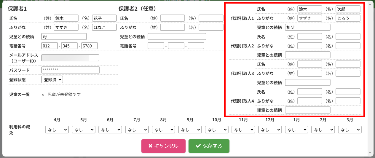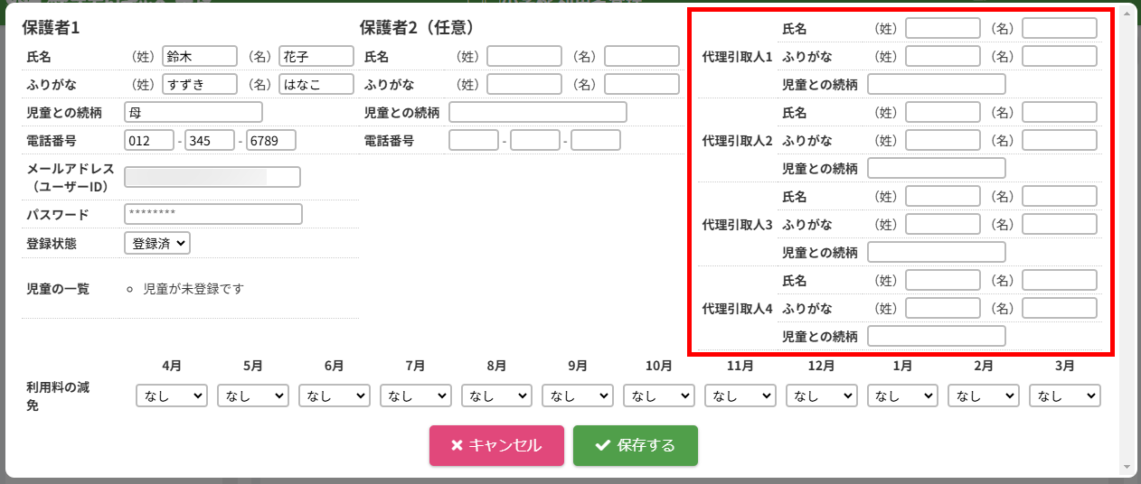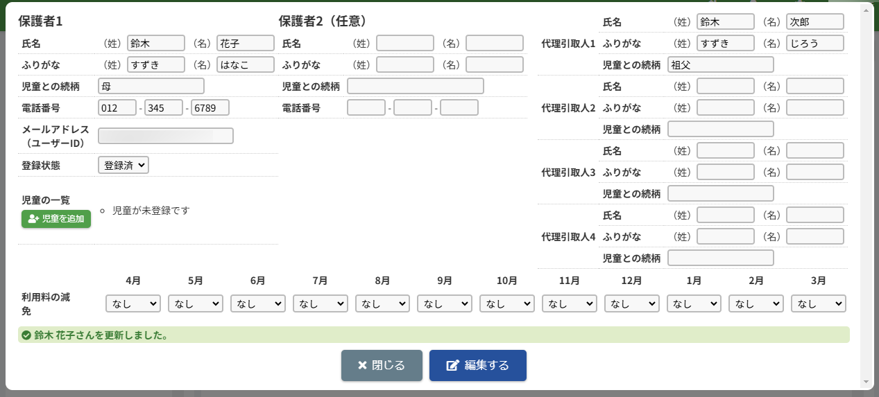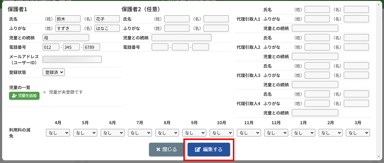 HOME > 利用者管理 > 代理引取人を登録・変更する 代理引取人を登録・変更する 「代理引取人を登録・変更する」では、児童の保護者本人以外がお迎えに来る場合の代理引取人を登録・変更する機能の確認が 出来ます。 保護者側からも代理引取人の登録はできますが、変更や削除はできません。 1.保護者編集フォームを開く 代理引取人を登録・変更したい保護者の氏名をクリックしてください。 2.代理引取人の編集を実行する 【編集する】ボタンをクリックして、次へ進みます。 3.編集内容を入力する 項目に沿って登録・変更したい内容を入力してください。削除したい場合は項目の内容を空にしてください。 4.代理引取人の編集を保存する 【保存する】ボタンをクリックして、次へ進みます。 5.代理引取人の編集を完了する 【閉じる】ボタンをクリックして、代理引取人の登録・変更は完了です。 利用料の減免を設定する ≫