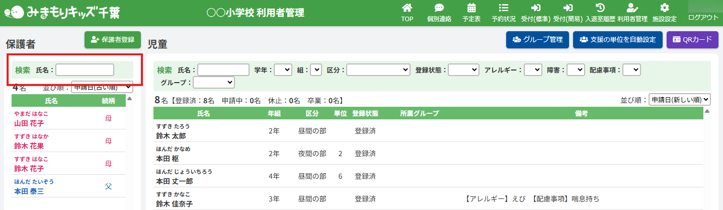 特定の保護者、児童を検索する