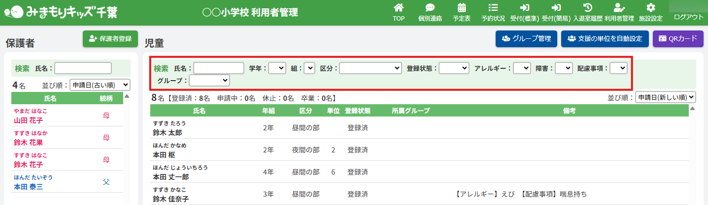 登録状態で児童の絞り込みを行えます。