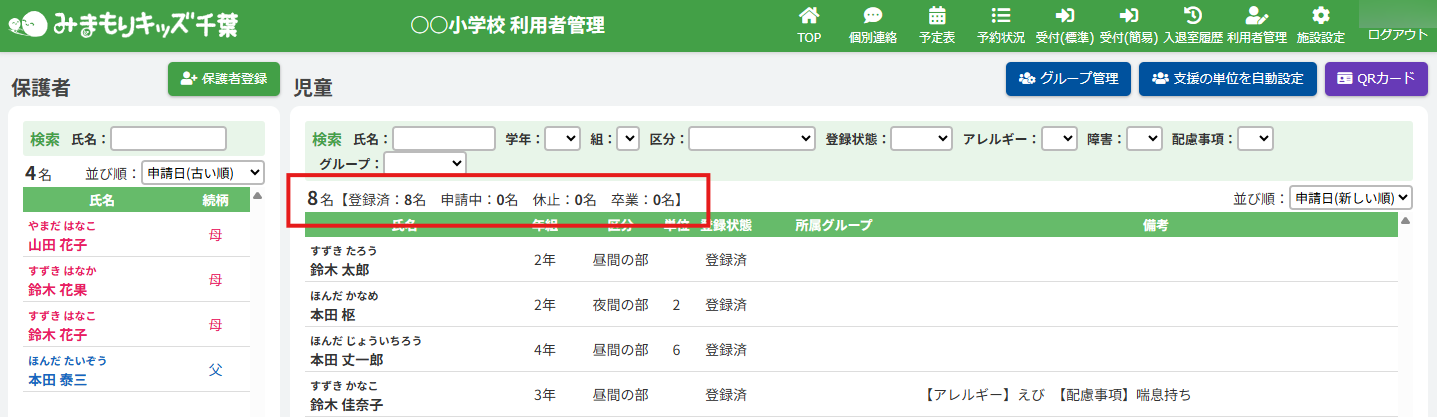 児童の合計人数と各登録状態の人数が表示されます。