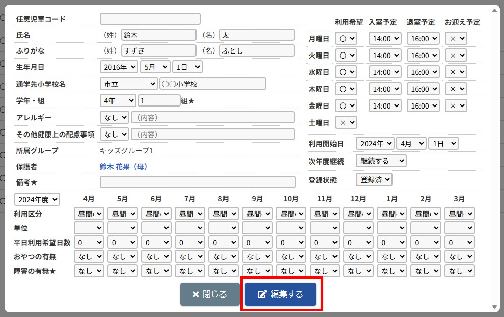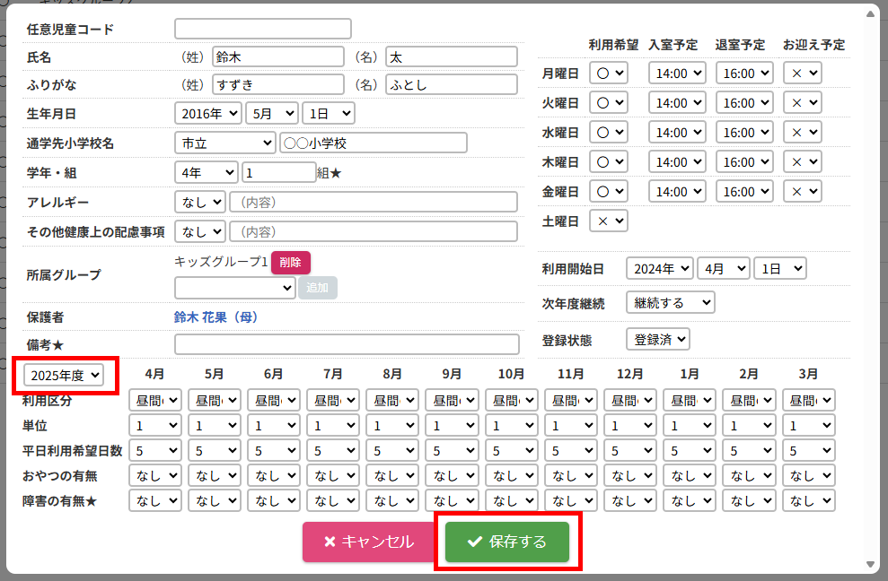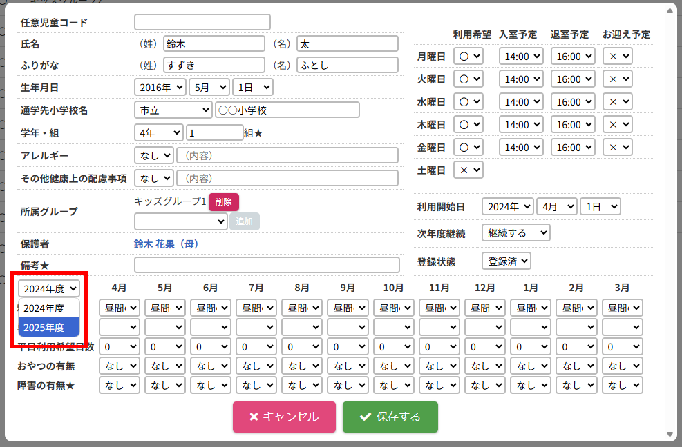 保護者より次年度の利用申込書を受け取り次第、この操作を行います。