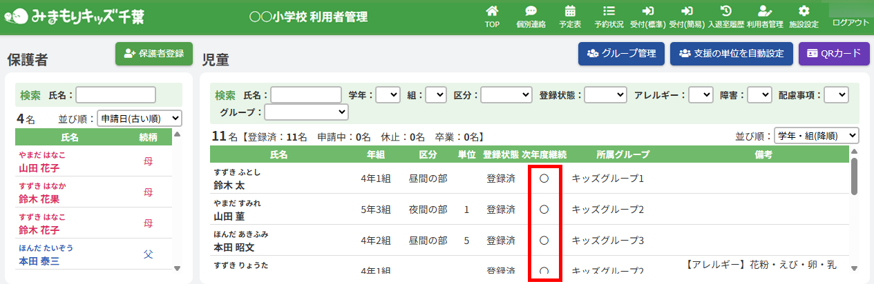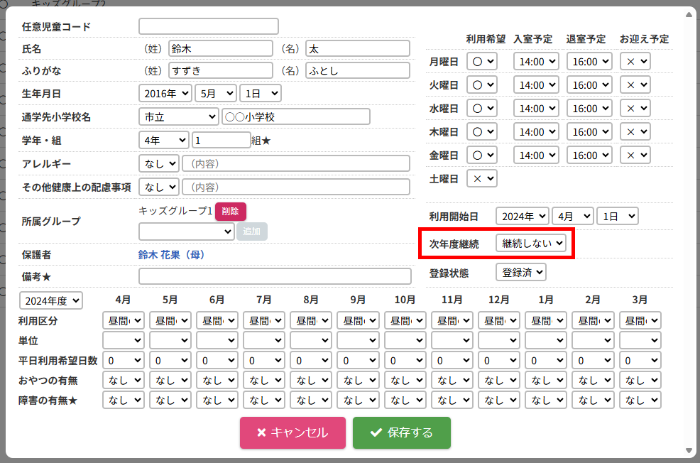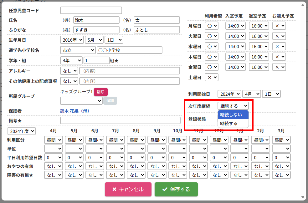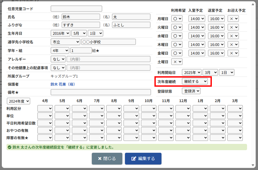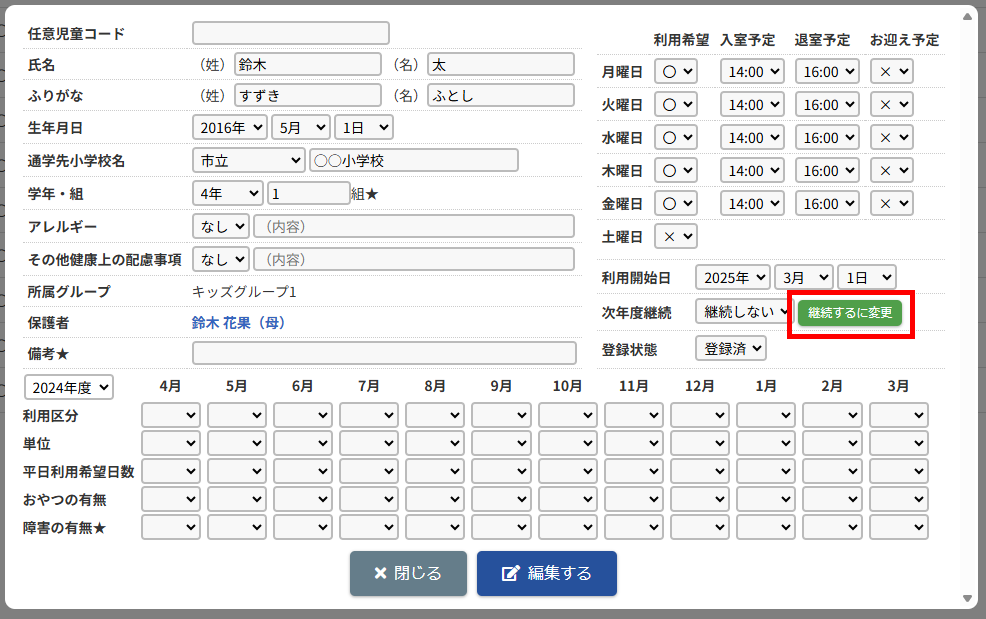 「継続する」に設定された児童は4月1日以降も継続して利用ができます。