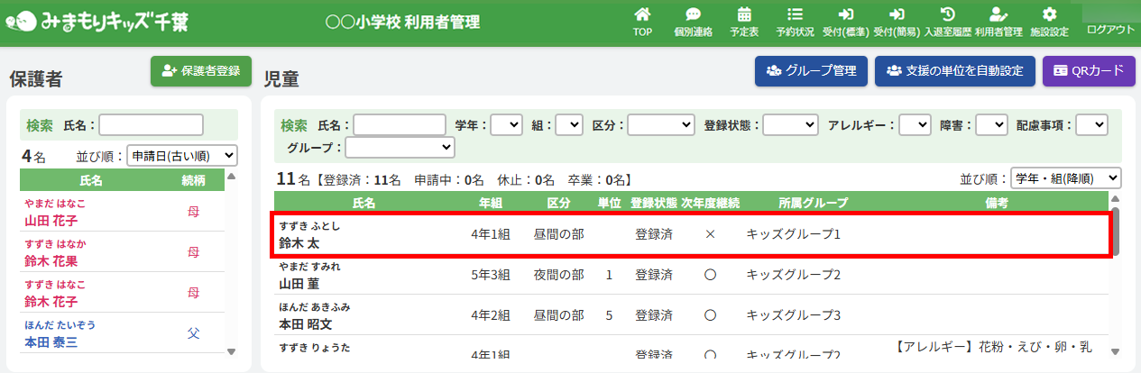削除されるわけではないので、「休止」となった児童を「登録済」に手動で変更すれば復帰(利用再開)させることもできます。