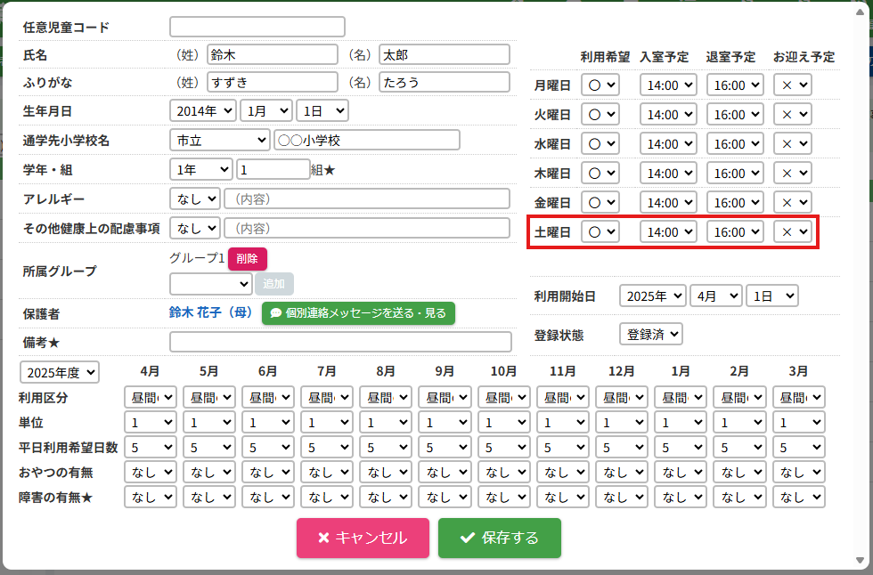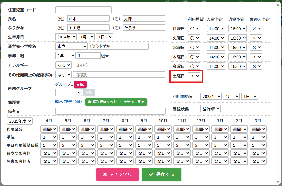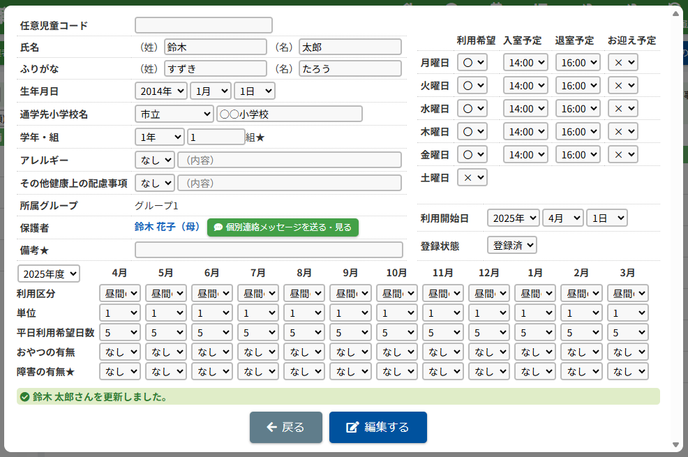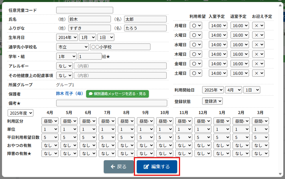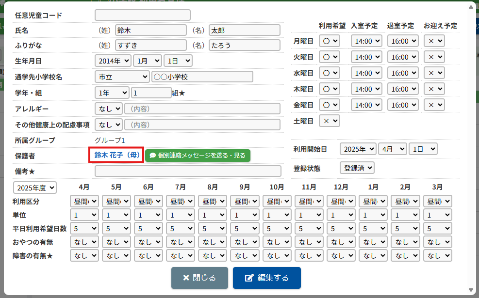 HOME > 利用者管理 > 児童の登録内容を変更する 児童の登録内容を変更する 「児童の登録内容を変更する」では、児童の登録内容を変更・編集する機能の確認ができます。 1.児童編集フォームを開く 児童の一覧から編集したい児童の氏名を選択してください。 <保護者編集フォームから児童の登録内容を変更する方法> 児童一覧からではなく、保護者編集フォームから児童編集フォームを開くこともできます。 (1)保護者編集フォームを開く 登録内容を変更したい児童の保護者の氏名をクリックしてください。 (2)児童編集フォームを開く 児童の一覧より編集したい児童の氏名をクリックしてください。 2.児童の登録内容の編集を実行する 【編集する】ボタンをクリックして、次へ進みます。 3.登録内容を変更する 項目に沿って変更したい内容を入力、選択してください。 4.児童の編集を保存する 【保存する】ボタンをクリックして、次へ進みます。 5.児童の編集を完了する 【閉じる】ボタンをクリックして、児童登録内容の変更は完了です。 <児童編集フォームから保護者編集フォームを開く方法> 保護者一覧からではなく、児童編集フォームから保護者編集フォームを開くこともできます。 児童編集フォーム内の保護者の氏名をクリックしてください。 保護者を編集する方法について、詳しくは下記の【保護者の登録内容を変更する】をクリックしてご確認ください。 保護者の登録内容を変更する ≫ 児童の登録内容の変更について、項目ごとにページを分けて説明しております。 詳しくは下記のリンクをクリックしてご確認ください。 児童の登録申請を承認する ≫ 支援の単位を設定する ≫ 平日利用希望日数を変更する ≫ 児童の利用を休止する ≫ 児童の利用を再開する ≫ 児童の登録を抹消する ≫ 児童の次年度継続を設定する ≫ 児童の登録申請を承認する ≫ 支援の単位を設定する ≫ 平日利用希望日数を変更する ≫ 児童の利用を休止する ≫ 児童の利用を再開する ≫ 児童の登録を抹消する ≫ 児童の登録を卒業に設定する ≫ 児童の次年度継続を設定する ≫ 児童の登録申請を承認する ≫