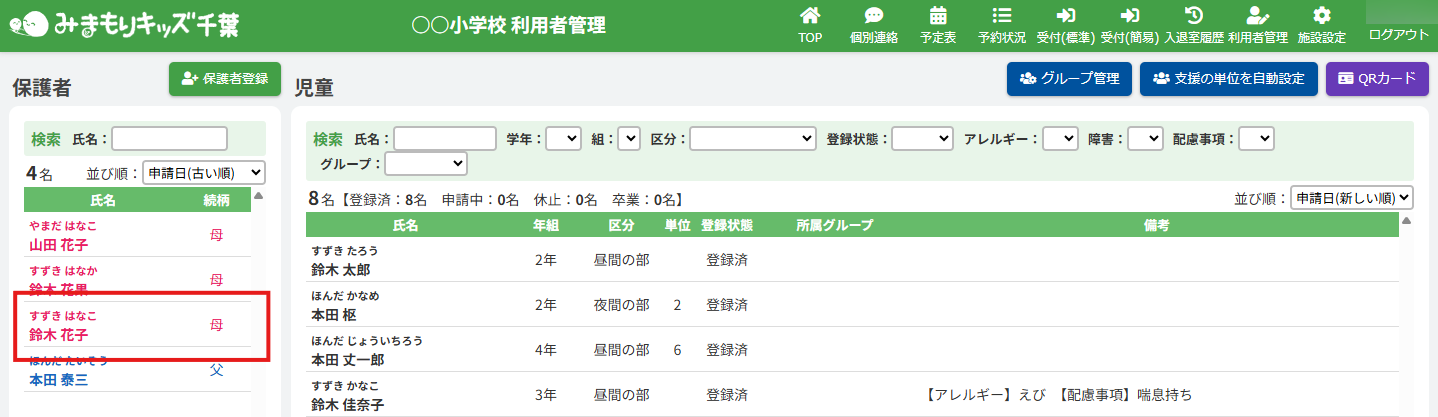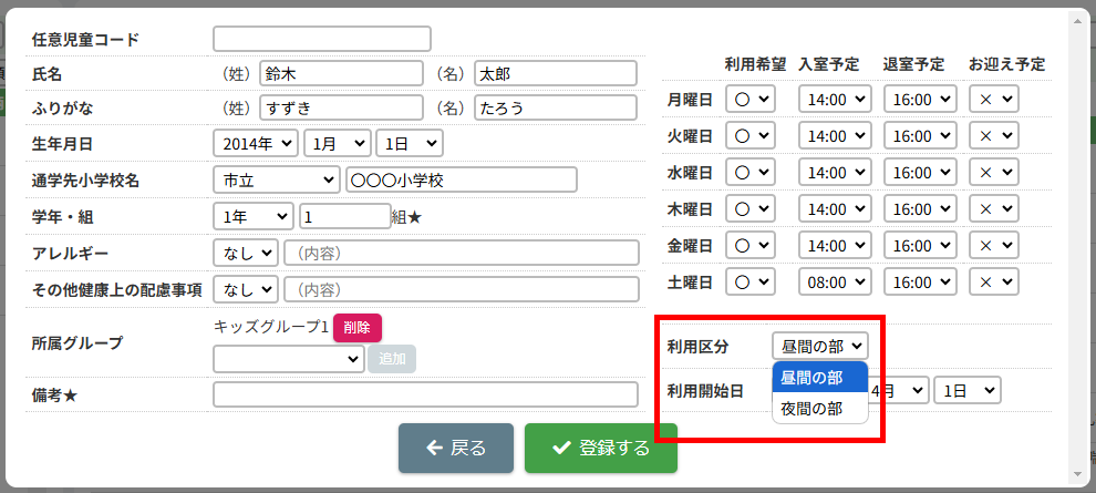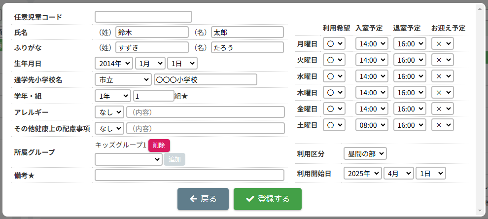 HOME > 利用者管理 > 児童を登録する 児童を登録する 「児童を登録する」では、施設側で児童情報を新規登録する機能の確認ができます。 ※施設側から児童を登録した場合は「登録状態」が「登録済」になります。 1.保護者編集フォームを開く 児童を登録したい保護者の氏名をクリックしてください。 2.児童を追加する 【児童を追加】ボタンをクリックし、登録内容入力欄へ進みます。 画像の例は、保護者に対してほかの児童が未登録な場合です。他に登録済みの場合は、一覧で表示されます。 <他の児童の登録がお済みの方> ご兄弟など他の児童を登録済みの場合は、一覧で表示されます。 3.登録内容を入力する 〇氏名・ふりがな・生年月日など、各項目を入力してください。 〇障害の有無は活動日誌や月別状況報告書(月報)に集計されるため、障害を持っている児童は必ず分類される項目を選択してください。 〇★マークのついている項目はセンシティブな内容を含むため、保護者側には表示されません。 〇所属グループは、児童が所属するグループを選択し、【追加】を押してください。複数グループを追加することも可能です。 〇曜日ごとの利用希望・入室予定・退室予定・お迎え予定・利用区分(子どもルームでは延長利用)・利用開始日を設定できます。 ・利用区分は児童が所属している区分【昼間の部】・【夜間の部】のいずれかを選択してください。 ・利用希望の曜日数は「対象児童」の計算で扱います。 <子どもルームでの画面表示> 児童登録の際の「利用区分」は、子どもルームとアフタースクールとでは表示が異なります。 子どもルームでは「延長利用」と表示されておりますので、延長利用をする場合は【利用する】、しない場合は【利用しない】を選択してください。 4.児童の登録を実行する 【登録する】ボタンをクリックして、次へ進みます。 5.児童の登録を完了する 【戻る】ボタンをクリックして児童登録は完了です。 ※施設側から児童を登録した場合は「登録状態」が「登録済」になります。 児童の登録内容を変更する ≫