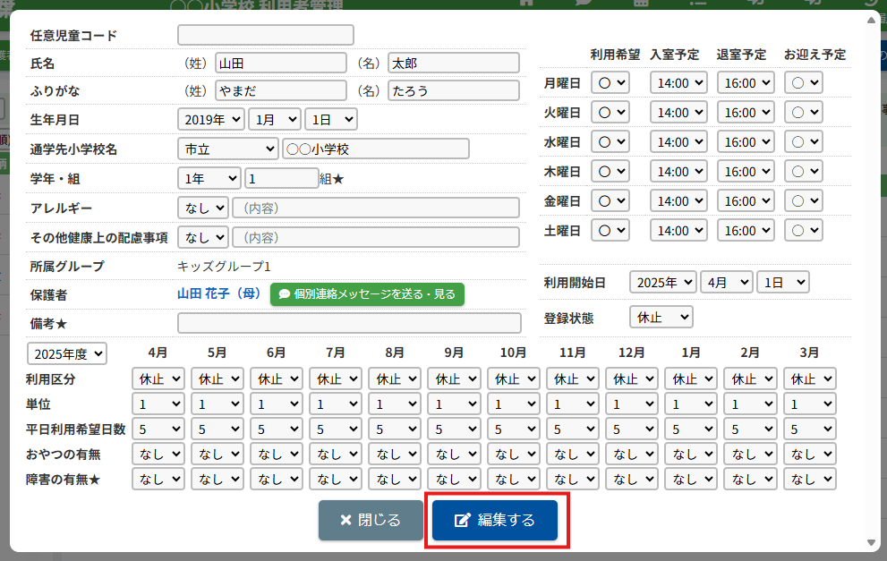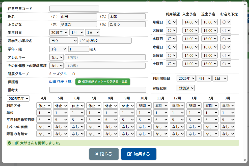 【閉じる】ボタンをクリックしたら、児童の利用の再開は完了です。