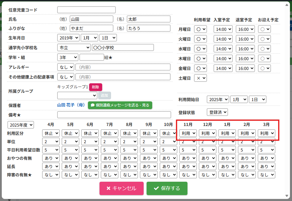 選択後、11月から翌3月までの月の利用区分が「利用」に変更されます。