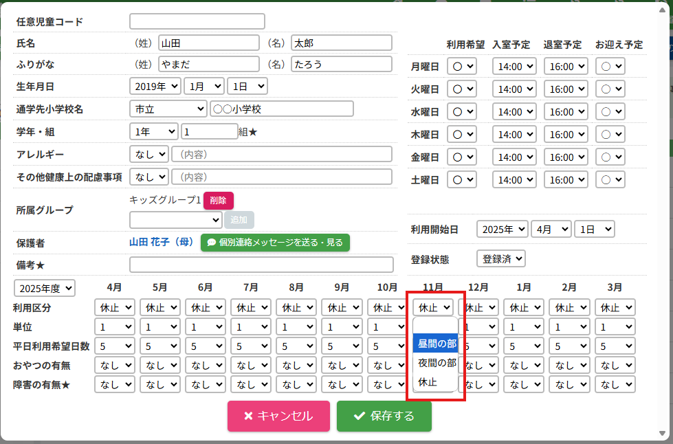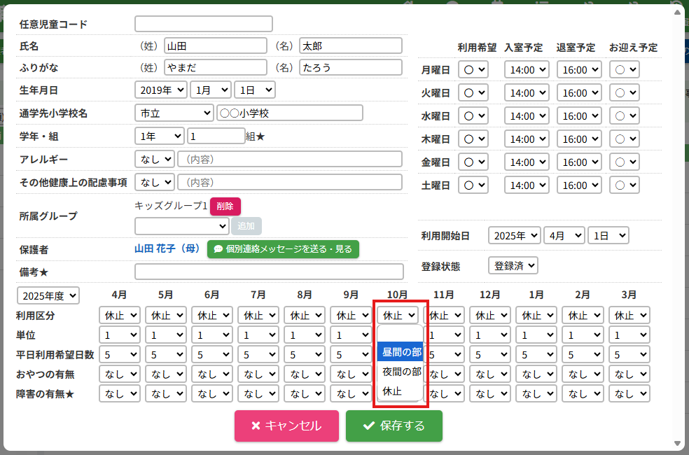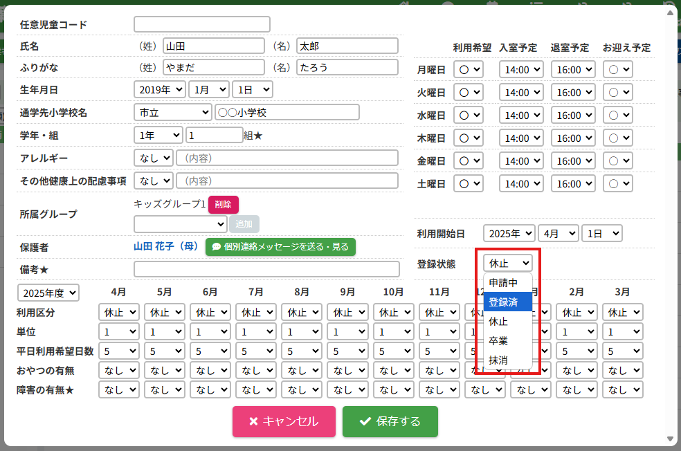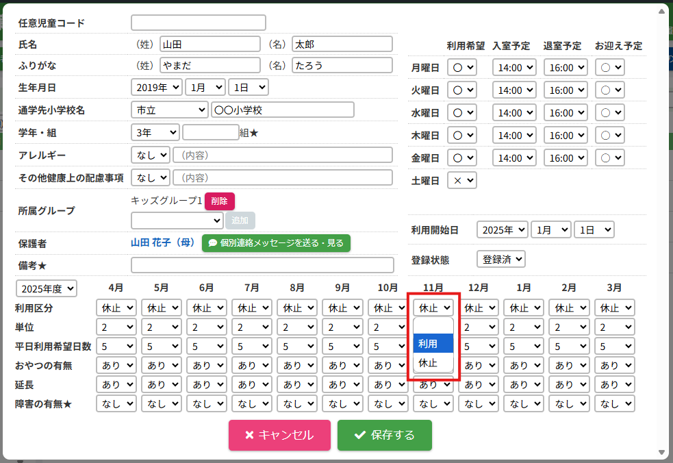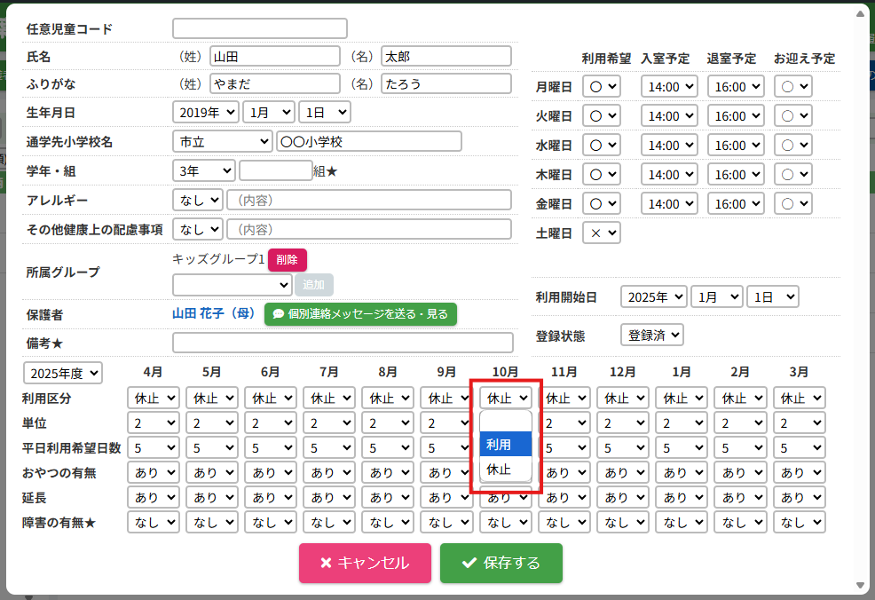 翌月以降から利用を再開する場合、登録状態は変更せず、再開する月の利用区分欄の選択肢から利用区分を選択してください。