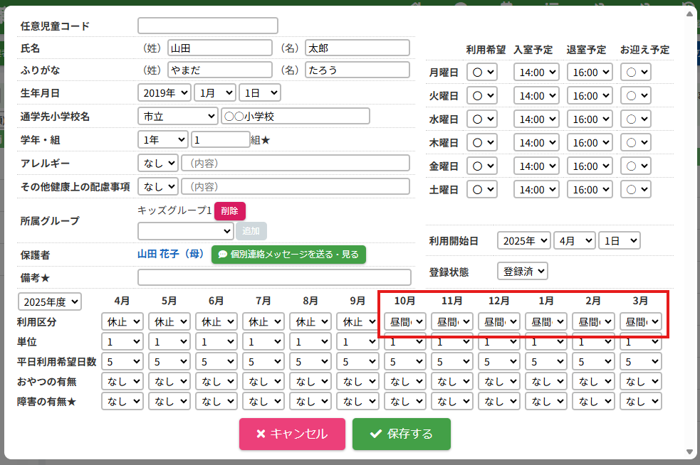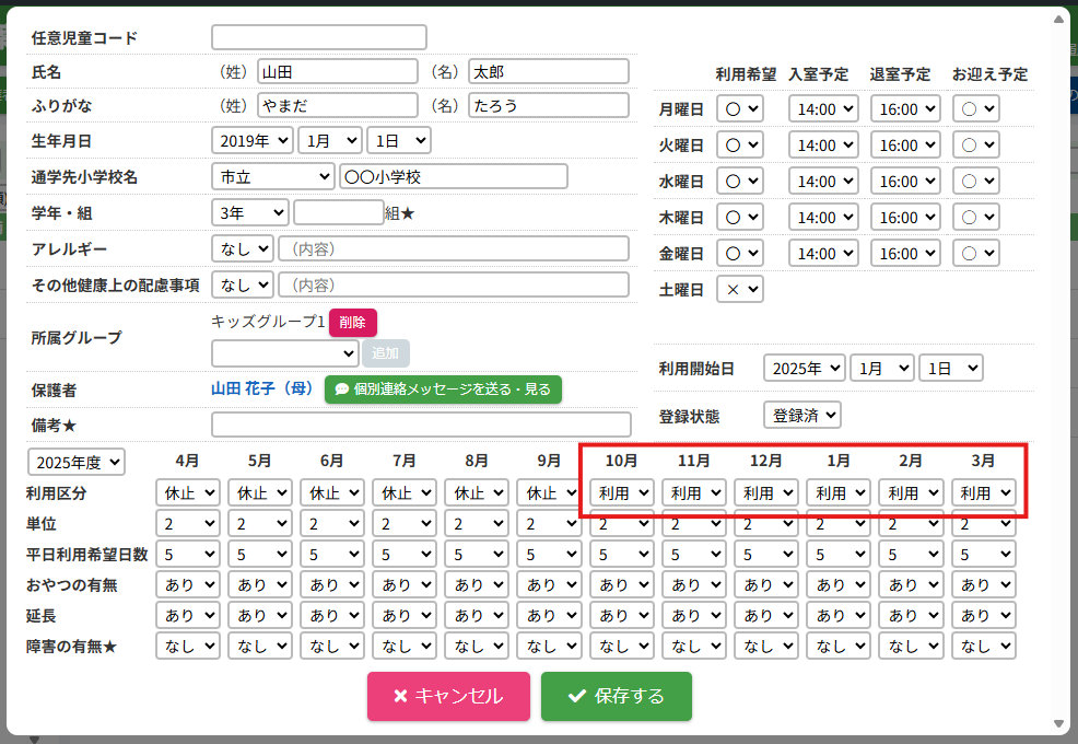選択後、10月から翌3月までの月の利用区分が「利用」に変更されます。