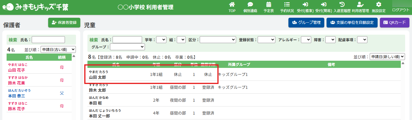 保護者の利用を休止する際は、まずその保護者の全ての児童の利用を休止してください。